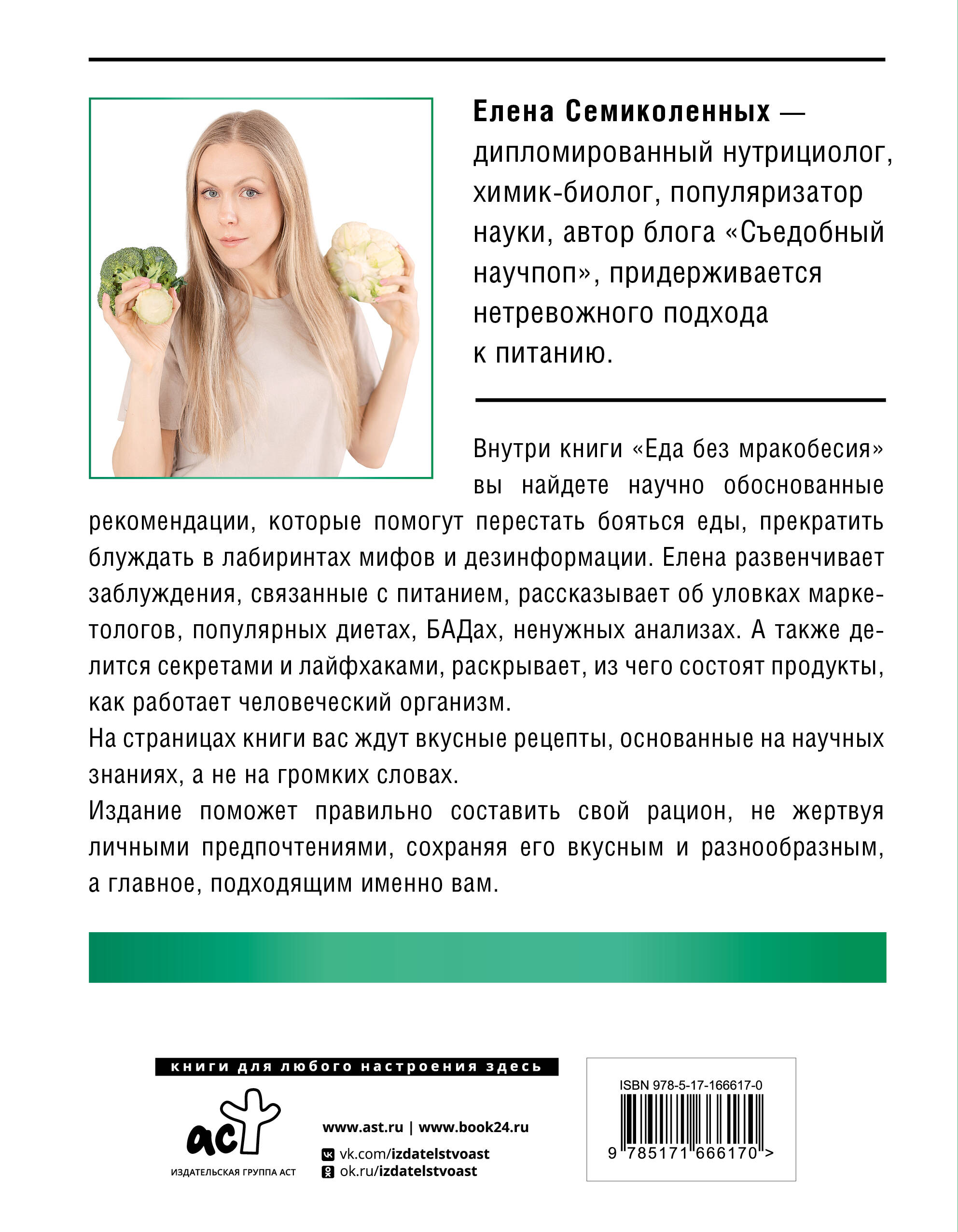 Елена Семиколенных - дипломированный нутрициолог, химик-биолог, популяризатор науки, автор блога "Съедобный научпоп", придерживается нетревожного подхода к питанию. Внутри книги "Еда без мракобесия" вы найдете научно обоснованные рекомендации, которые помогут перестать бояться еды, прекратить блуждать в лабиринтах мифов и дезинформации. Елена развенчивает заблуждения, связанные с питанием, рассказывает об уловках маркетологов, популярных диетах, БАДах, ненужных анализах. А также делится секретами и лайфхаками, раскрывает, из чего состоят продукты, как работает человеческий организм. На страницах книги вас ждут вкусные рецепты, основанные на научных знаниях, а не на громких словах. Издание поможет правильно составить свой рацион, не жертвуя личными предпочтениями, сохраняя его вкусным и разнообразным, а главное, подходящим именно вам.| Издательство | Издательство "АСТ" |
