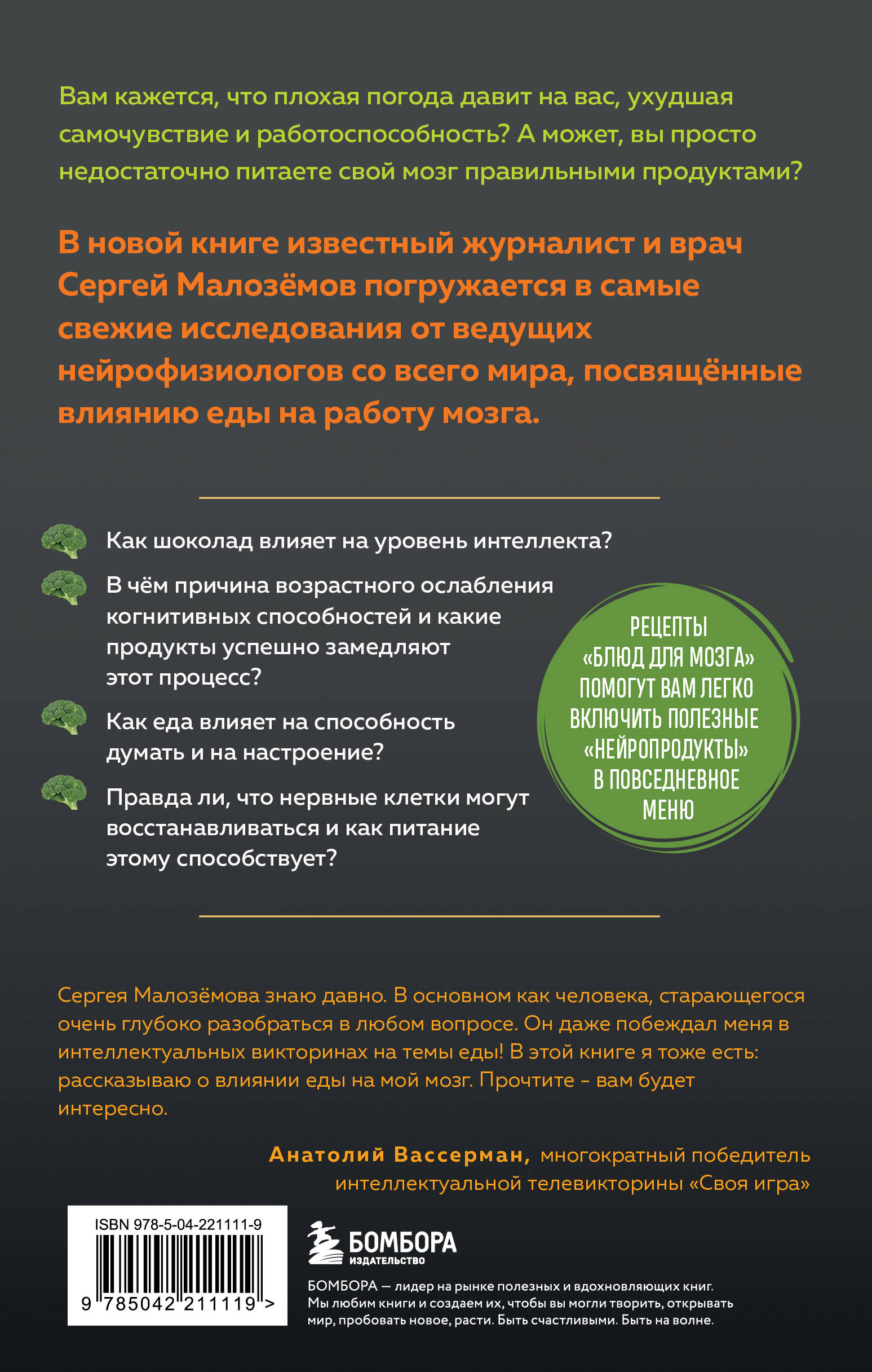 Вам кажется, что плохая погода давит на вас, ухудшая самочувствие и работоспособность? А может, вы просто недостаточно питаете свой мозг правильными продуктами? • Как шоколад влияет на уровень интеллекта? • В чём причина возрастного ослабления когнитивных способностей и какие продукты успешно замедляют этот процесс? • Как еда влияет на способность думать и на настроение? • Правда ли нервные клетки могут восстанавливаться и как питание этому способствует? В новой книге известный журналист и врач Сергей Малозёмов погружается в самые свежие исследования от ведущих нейрофизиологов со всего мира, посвящённые влиянию еды на работу мозга. «Сергея Малозёмова знаю давно. В основном как человека, старающегося очень глубоко разобраться в любом вопросе. Он даже побеждал меня в интеллектуальных викторинах на темы еды! В этой книге я тоже есть: рассказываю о влиянии еды на мой мозг. Прочтите - вам будет интересно». - Анатолий Вассерман, многократный победитель интеллектуальной телевикторины «Своя игра»| Издательство | ООО "Издательство "Эксмо" |
