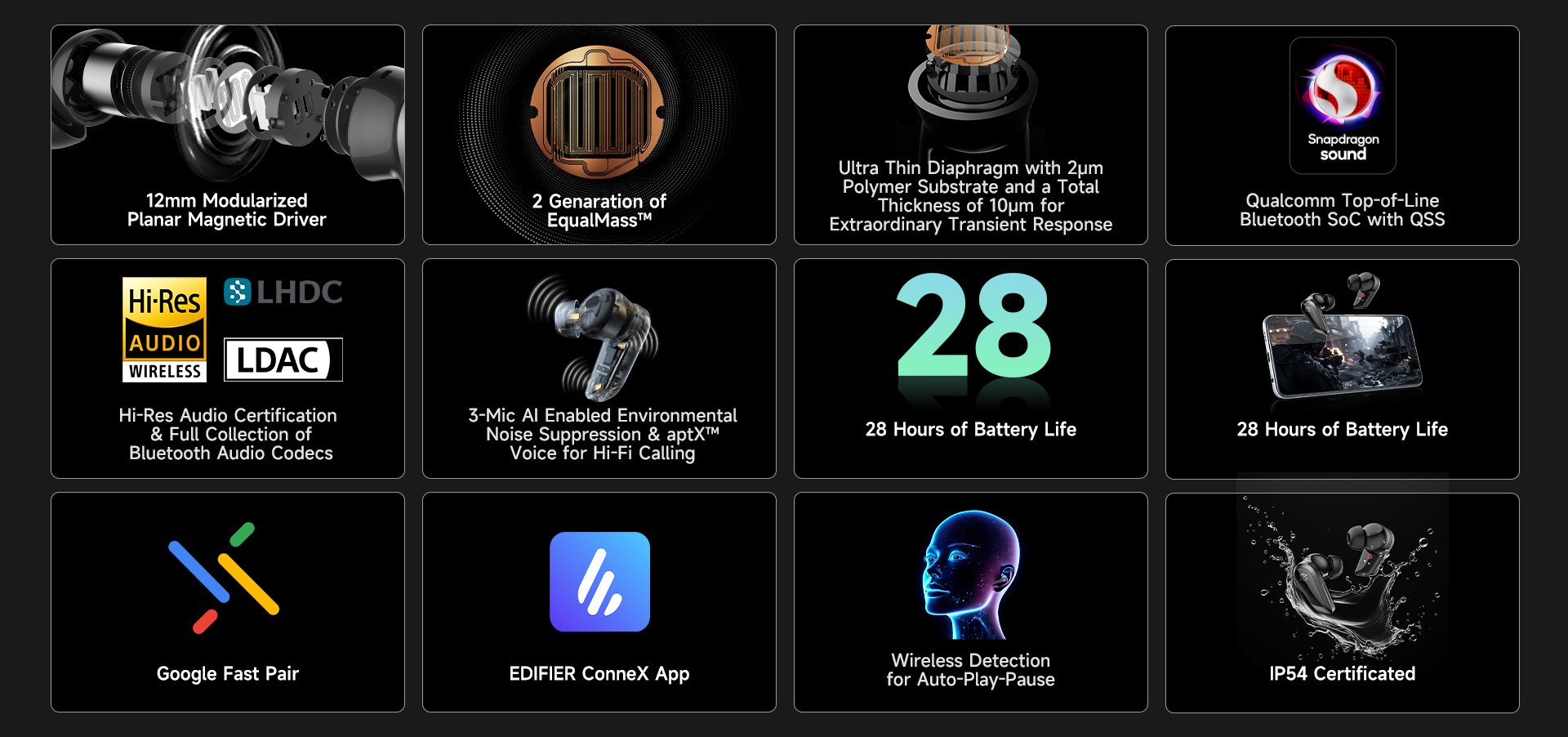 <p><strong>Edifier STAX SPIRIT S10 True Wireless Планарно-магнитные наушники с активным шумоподавлением</strong></p><br /> <p><strong>Характеристики:</strong></p><br /> <p>- Первые в мире планарно-магнитные наушники TWS с активным шумоподавлением.<br>- 12-миллиметровые модулированные планарно-магнитные драйверы обеспечивают равномерную производительность и возможность шумоподавления.<br>- Ультратонкая мембрана из полимерного субстрата толщиной 2 мкм, разработанная для быстрого и точного отклика на переходные процессы.<br>- Запатентованная EDIFIER технология проводки EqualMass™ 2-го поколения для стабильной работы планарного драйвера с поршневым движением.<br>- Qualcomm® QCC5181 Bluetooth® SoC с набором технологий Snapdragon Sound для эффективной обработки.<br>- Сертификация Hi-Res Wireless Audio и HD-кодеки, гарантирующие превосходное качество звука и универсальную совместимость.<br>- Подавление окружающего шума с помощью 3-микрофона и технология Qualcomm aptX® Voice обеспечивают четкие звонки.<br>- Время работы от аккумулятора до 28 часов (шумоподавления выключено с зарядным чехлом), доступна быстрая зарядка. 15 минут зарядки для 2 часов воспроизведения.<br>- Персонализируйте стиль прослушивания и настройте элементы управления с помощью приложения EDIFIER ConneX.<br>- Сертификация IP54 по защите от пыли и брызг воды для длительного срока службы.<br>- Доступен игровой режим с низкой задержкой 89 мс.</p><br /> <p><strong>Характеристики:</strong></p><br /> <p>Производитель: Edfier<br>Модель: Stax Spirit S10<br>Цвет: черный<br>Версия Bluetooth: 5.4<br>Чипсет Bluetooth: Qualcomm® QCC5181<br>Профили Bluetooth: A2DP, AVRCP, HFP<br>Аудиокодеки: LHDC 5.0, LDAC, aptX™ Lossless, aptX™ Adaptive, aptX™ Voice, Snapdragon Sound™, AAC, SBC<br>Частотная характеристика: 20 Гц - 40 кГц<br>Уровень звукового давления: 92 ± 3 дБ(А)<br>ANC: Да (-50 дБ)<br>Драйвер: 12-миллиметровый планарно-магнитный драйвер</p><br /> <p>Время воспроизведения:<br>~ ANC включено: 7 часов (наушники) + 21 час (зарядный футляр)<br>~ ANC выключено: 5 часов (наушники) + 15 часов (зарядный футляр)</p><br /> <p>Время зарядки:<br>~ 1,5 часа (наушники)<br>~ 1,5 часа (зарядный футляр)<br>Быстрая зарядка: 10 мин = 2 часа</p><br /> <p>Степень защиты IP: IP54<br>Порт зарядки: USB-C (Type-C)<br>Зарядка: USB-C 5 В/1 А<br>Вес нетто:<br>- 6,5 г (каждый наушник)<br>- 56 г (зарядный футляр)</p>
