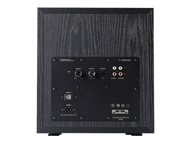 <p>Активный сабвуфер<br>Кабель питания<br>Аудиокабель 3,5 мм - RCA<br>Аудиокабель RCA - RCA<br>Руководство пользователя<br>Бренд: Edifier<br>Модель: T5<br>Общая выходная мощность: RMS 70 Вт<br>Соотношение сигнал/шум: ≥85 дБ (A)<br>Частотная характеристика: 38 Гц - 200 Гц<br>Уровень шума: ≤25 дБ (A)<br>Входная чувствительность: 50±20 мВ<br>Порты: DC, x2 RCA<br>Сопротивление: 2 Ом</p>