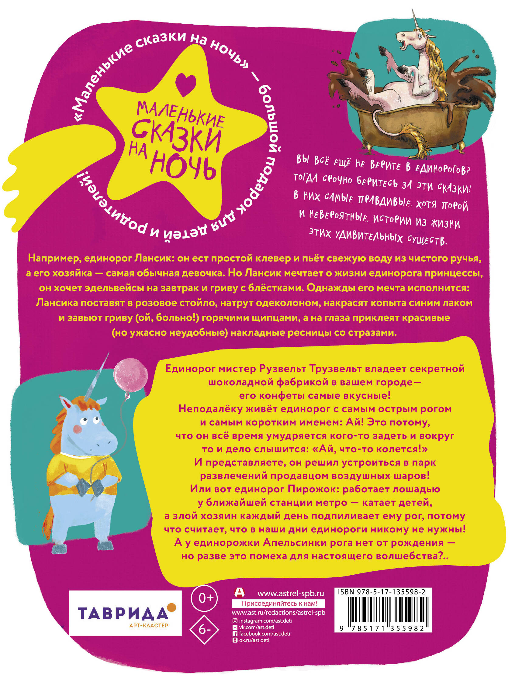 Вы всё ещё не верите в единорогов? Тогда срочно беритесь за эти сказки! В них самые правдивые, хотя порой и невероятные, истории из жизни этих удивительных существ. Например, единорог Лансик: он ест простой клевер и пьет свежую воду из чистого ручья, а его хозяйка - самая обычная девочка. Но Лансик мечтает о жизни единорога принцессы, он хочет эдельвейсы на завтрак и гриву с блёстками. Однажды его мечта исполнится: Лансика поставят в розовое стойло, натрут одеколоном, накрасят копыта синим лаком и завьют гриву (ой, больно!) горячими щипцами, а на глаза приклеят красивые (но ужасно неудобные) накладные ресницы со стразами. Единорог мистер Рузвельт Трузвельт владеет секретной шоколадной фабрикой в вашем городе - его конфеты самые вкусные! Неподалеку живёт единорог с самым острым рогом и самым коротким именем: Ай! Это потому что он всё время умудряется кого-то задеть и вокруг то и дело слышится "Ай, что-то колется!". И представляете, он решил устроиться в парк развлечений продавцом воздушных шаров! Или вот единорог Пирожок: работает лошадью у ближайшей станции метро - катает детей, а злой хозяин каждый день подпиливает ему рог, потому что считает, что в наши дни единороги никому не нужны! А у единорожки Апельсинки рога нет от рождения - но разве это помеха для настоящего волшебства?.. Помимо историй, отобранных в результате открытого конкурса на сайте "Астрель-СПб", в сборник вошла сказка, победившая на мастер-классе Кати Матюшкиной в рамках фестиваля "Таврида".| Издательство | ИЗДАТЕЛЬСТВО "АСТ" |