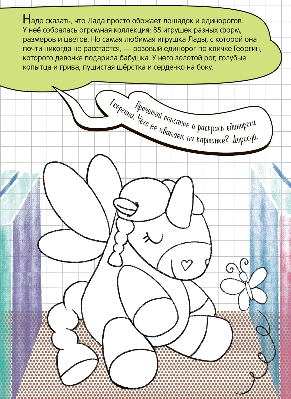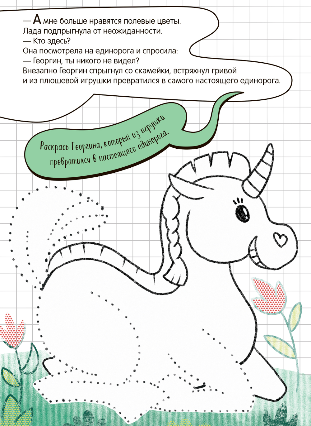 Книга «Единорог и Лада» серии «Дорисуй сам» развивает мелкую моторику, художественные навыки, речь, воображение, а также расширяет представления об окружающем мире. В процессе чтения сказки о дружбе единорога Георгина и девочки Лады ребенок сможет также почувствовать себя настоящим художником, ведь иллюстрации в книге не дорисованы. Внутри разные типы заданий: пошаговое рисование и дорисовашки по точкам; раскраски; пустые страницы для собственных композиций, иллюстрирующих историю.| Издательство | Мозаика-Синтез |