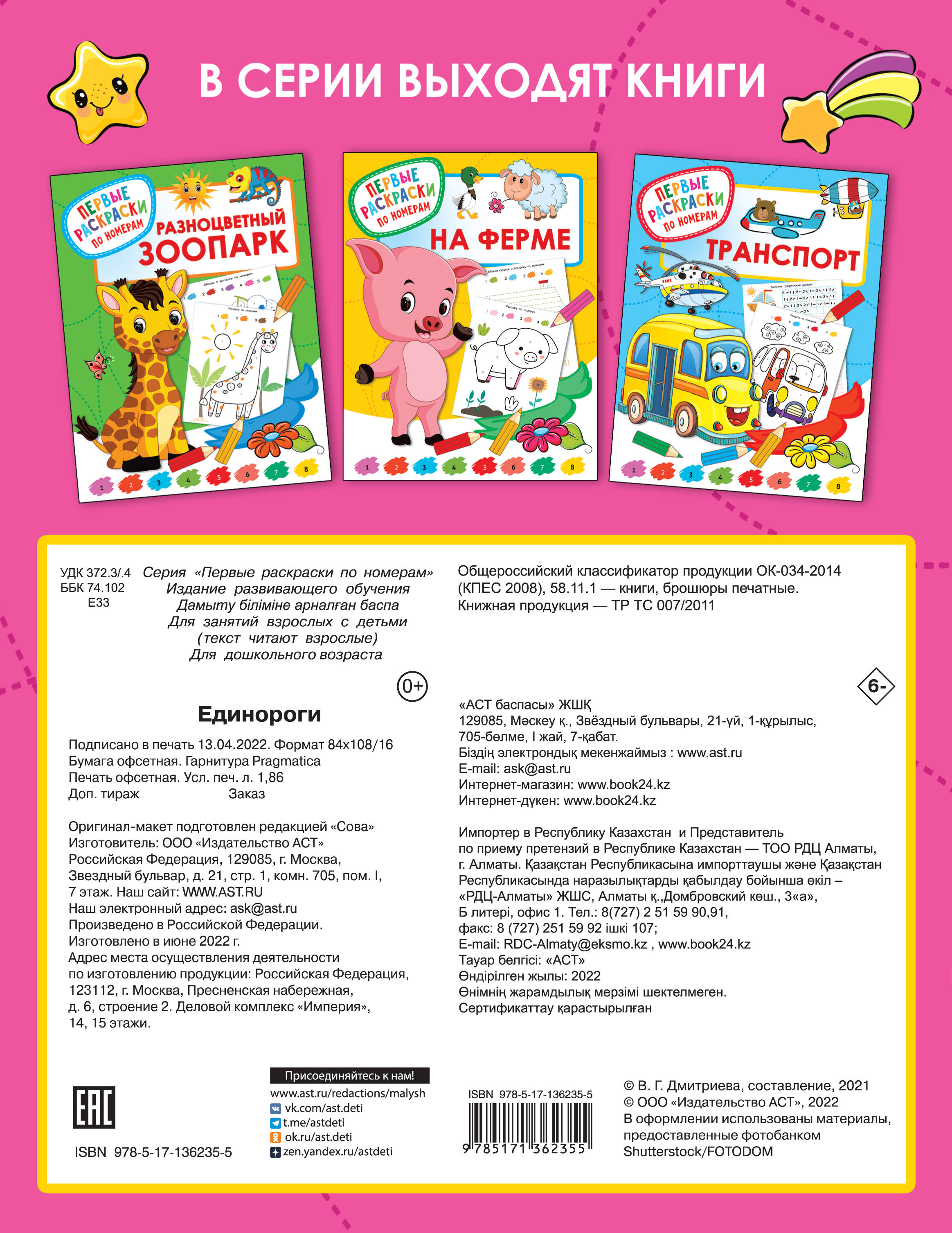 О чем эта книга Новая увлекательная книжка в серии «Первые раскраски по номерам» - путешествие в мир арифметических раскрасок, логических задачек и графических диктантов. Кому эта книга будет интересна Это книга веселых интеллектуальных игр для настоящих умников и умниц. Каковы особенности этой книги • Раскрашивание картинок по номерам - прекрасное занятие для развития мелкой моторики, наблюдательности, смекалки и знакомства с цифрами. • Ребенок будет раскрашивать картинки с числами и примерами на сложение и вычитание - и получит навыки счета от 1 до 10. • Выполняя графические диктанты, дошкольники учатся ориентироваться на листе бумаги, осваивают понятия «вверх», «вниз», «влево», «вправо». • Простые и интересные задания тренируют графические навыки, развивают образное мышление и воображение, сообразительность и логику. • Книжка помогает раскрыть творческий потенциал ребенка, дарит ему множество положительных эмоций. Раскрашиваем картинки с числами и примерами, развиваем логику, внимание, осваиваем счет до 10!