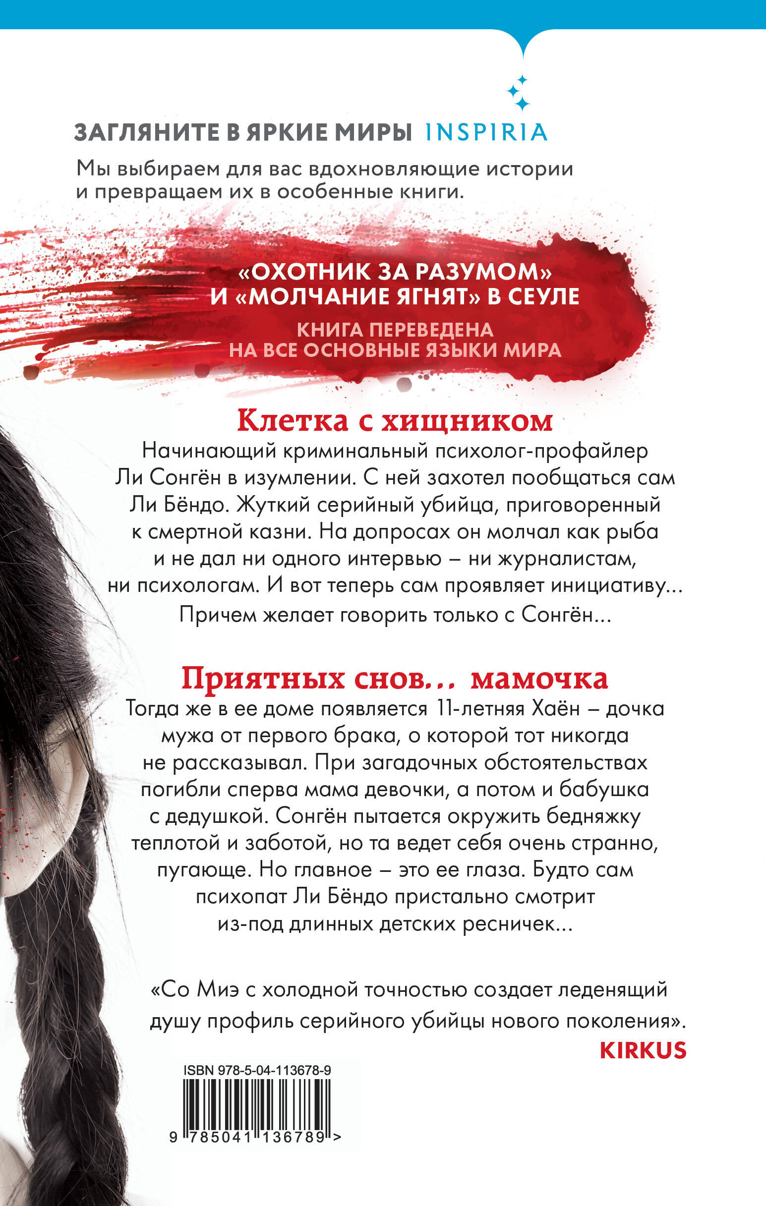 Абсолютный бестселлер в Южной Корее. «Охотник за разумом» и «Молчание ягнят» в Сеуле. Книга переведена на все основные языки мира. Убийцами рождаются - или становятся? Этот триллер - пронзительная иллюстрация процессов психологического разложения в семье, когда невинный ребенок развращается жестокостью и безразличием взрослых. Написано с такой достоверной изобретательностью, что в конце читатель теряет дар речи. «Клетка с хищником» Начинающий криминальный психолог-профайлер Ли Сонгён в изумлении. С ней захотел пообщаться сам Ли Бёндо. Жуткий серийный убийца, приговоренный к смертной казни. На допросах он молчал, как рыба, и не дал ни одного интервью - ни журналистам, ни психологам. И вот теперь сам проявляет инициативу… Причем желает говорить только с Сонгён… «Приятных снов… мамочка» Тогда же в ее доме появляется 11-летняя Хаён - дочка мужа от первого брака, о которой тот никогда не рассказывал. При загадочных обстоятельствах погибли сперва мама девочки, а потом и бабушка с дедушкой. Сонгён пытается окружить бедняжку теплотой и заботой, но та ведет себя очень странно, пугающе. Но главное - это ее глаза. Будто сам психопат Ли Бёндо пристально смотрит из-под длинных детских ресничек… «Со Миэ с холодной точностью создает леденящий душу профиль серийного убийцы нового поколения». - Kirkus «Мощное пополнение в растущем списке южнокорейской остросюжетной литературы». - Los Angeles Times «Со Миэ ненавязчиво раскручивает повествование, постепенно ужесточая его, - и подводит к шокирующей концовке… Она мастерски показывает вспышки человечности в безжалостном убийце». - Publishers Weekly «Для поклонников сериала «Охотник за разумом». Этот роман выглядит как true crime, однако он является блестящей художественной работой. А концовка у него такая, что вы ее никогда не забудете». - Алма Катсу «Мрачная и электризующая книга». - Джош Малерман| Издательство | ООО "Издательство "Эксмо" |