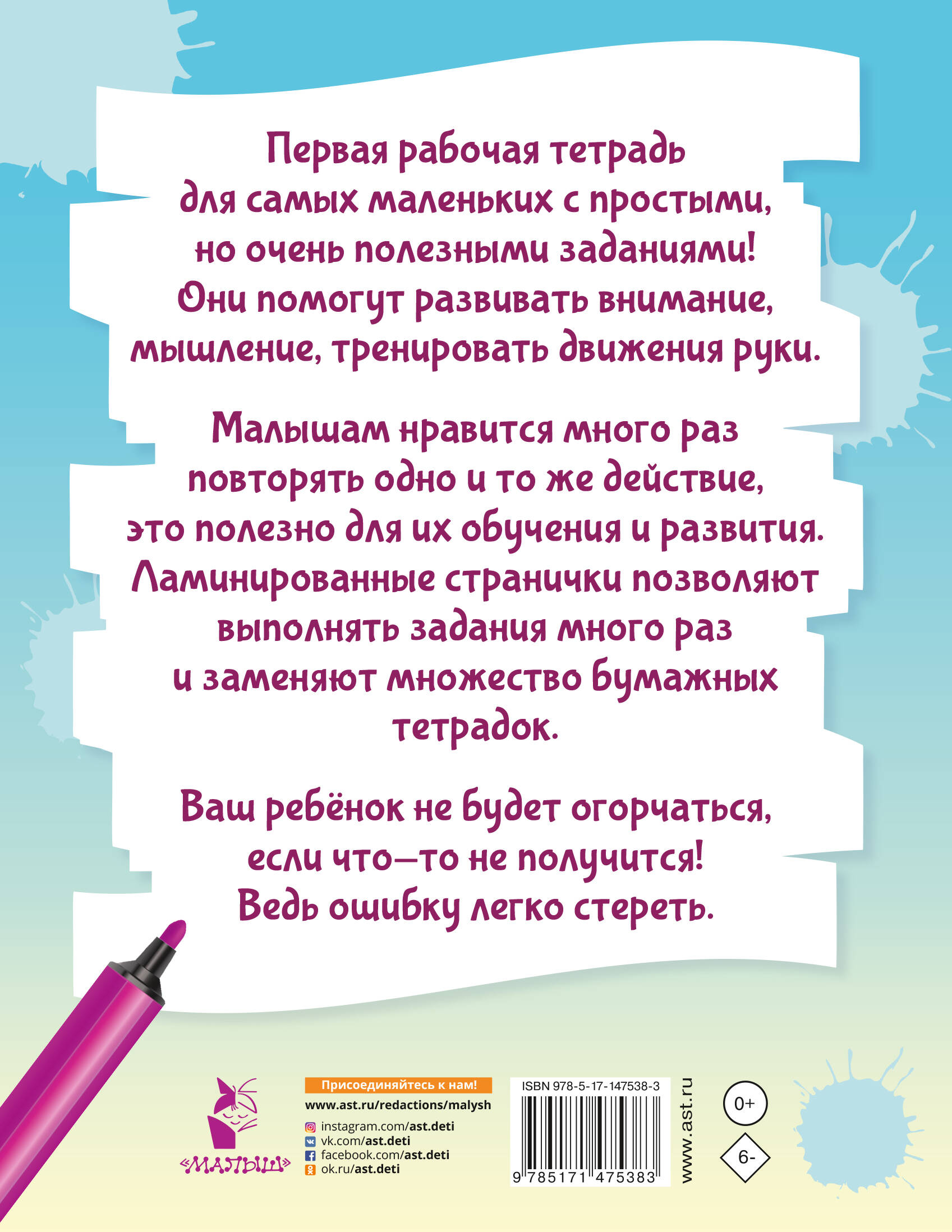 Первая рабочая тетрадь для самых маленьких с простыми, но очень полезными заданиями! Они помогут развивать внимание, мышление, тренировать движения руки. Малышам нравится много раз повторять одно и то же действие, это полезно для их обучения и развития. Ламинированные странички позволяют выполнять задания много раз и заменяют множество бумажных тетрадок. Ваш ребёнок не будет огорчаться, если что-то не получится! Ведь ошибку легко стереть.| Издательство | АСТ |