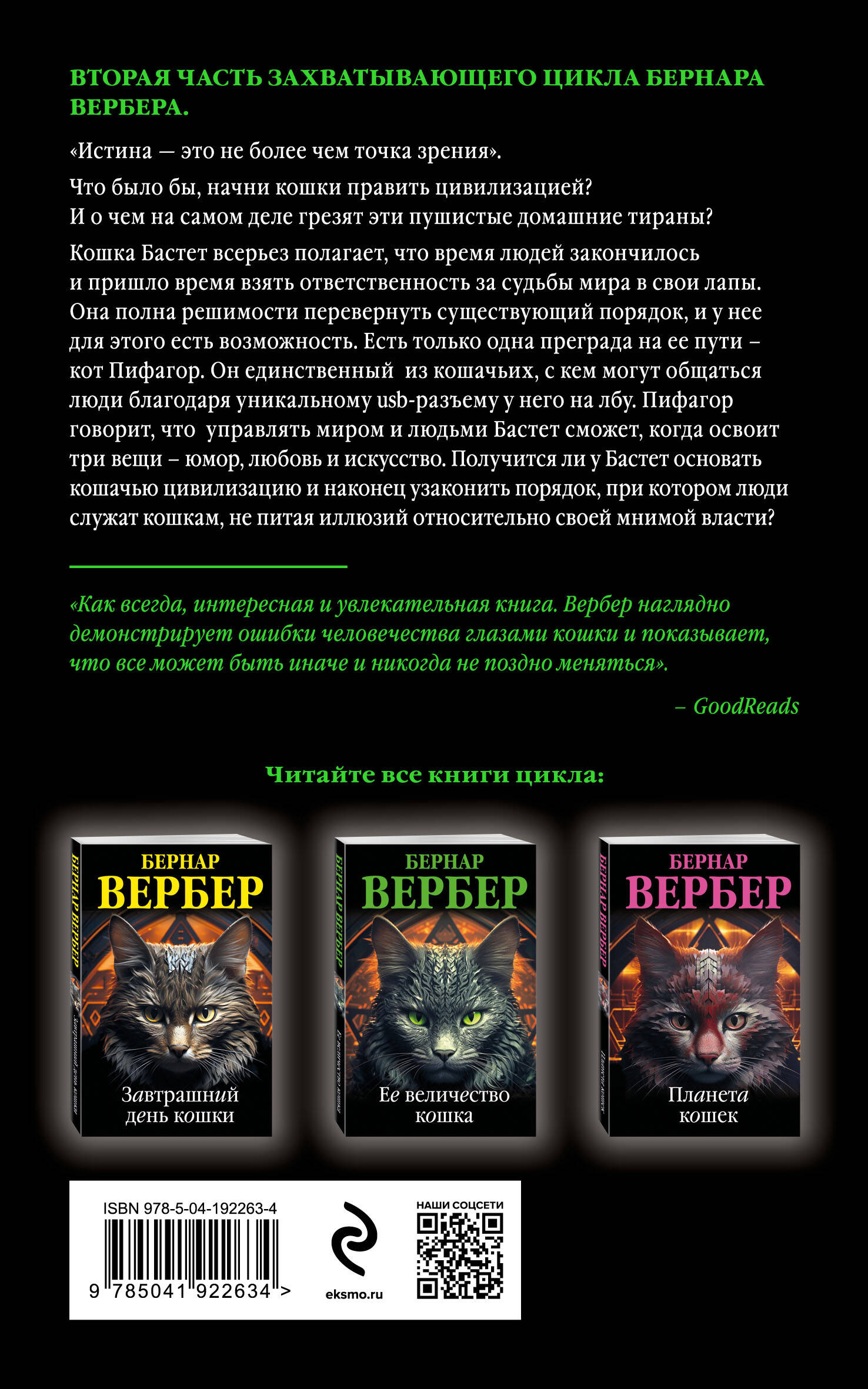 НОВОЕ ОФОРМЛЕНИЕ ЗНАМЕНИТОГО ЦИКЛА БЕРНАРА ВЕРБЕРА ПО ДОСТУПНОЙ ЦЕНЕ! Вторая часть цикла. «Истина - это не более, чем точка зрения». Что было бы, начни кошки править цивилизацией? И о чем на самом деле грезят эти пушистые домашние тираны? Кошка Бастет всерьез полагает, что время людей закончилось и пришло время взять ответственность за судьбы мира в свои лапы. Она полна решимости перевернуть существующий порядок, и у нее для этого есть возможность. Есть только одна преграда на ее пути - кот Пифагор. Он единственный из кошачьих, с кем могут общаться люди благодаря уникальному usb-разъему у него на лбу. Пифагор говорит, что управлять миром и людьми Бастет сможет, когда освоит три вещи - юмор, любовь и искусство. Получится ли у Бастет основать кошачью цивилизацию и наконец узаконить порядок, при котором люди служат кошкам, не питая иллюзий относительно своей мнимой власти? «Как всегда, интересная и увлекательная книга. Вербер наглядно демонстрирует ошибки человечества глазами кошки и показывает, что все может быть иначе и никогда не поздно меняться». - GoodReads| Издательство | ООО "Издательство "Эксмо" |