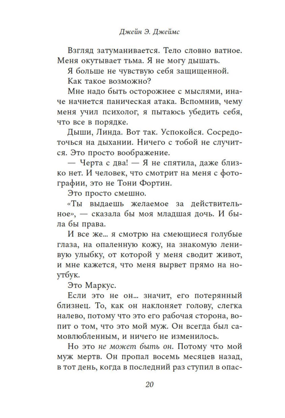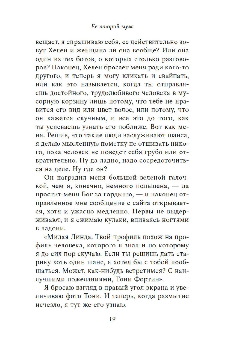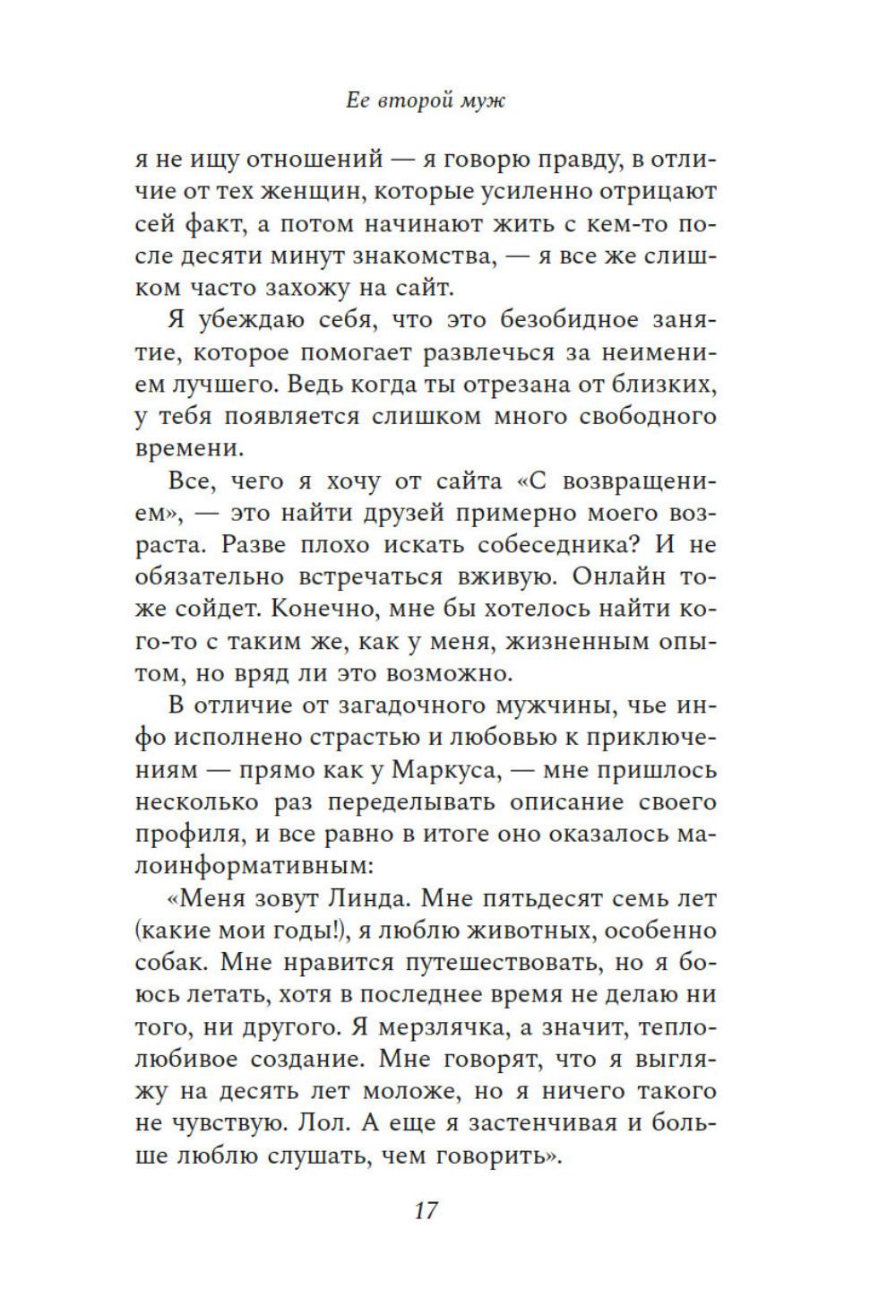 Ваш муж мертв. Он никогда не вернется. Так почему же он на сайте знакомств приглашает вас на свидание? У Линды были преданный муж, взрослые дочери и великолепный дом. Все это она променяла на любовь и брак с человеком, которого едва знала. Но сказка продлилась недолго. Теперь Линда без гроша в кармане живет в съемной квартирке. От скуки она регистрируется на сайте знакомств и находит анкету мужчины, как две капли воды похожего на ее второго мужа. Но это невозможно - ведь он утонул у берегов Корфу восемь месяцев назад. Линда понимает, что мужчина, за которого она так опрометчиво и быстро вышла замуж, хранил от нее секреты - мрачные пугающие. И единственный, кто может ей сейчас помочь, - это человек, имеющий все основания не вмешиваться. Ее первый муж.| Издательство | Азбука |