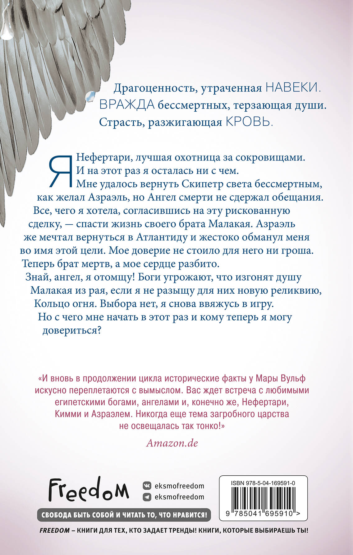 Я Нефертари, лучшая охотница за сокровищами. И на этот раз я осталась ни с чем. Мне удалось вернуть Скипетр света бессмертным, как желал Азраэль, но Ангел смерти не сдержал обещания. Все, чего я хотела, согласившись на эту рискованную сделку - спасти жизнь своего брата Малакая. Азраэль же мечтал вернуться в Атлантиду и жестоко обманул меня во имя этой цели. Мое доверие не стоило для него ни гроша. Теперь брат мертв, а мое сердце разбито. Знай, ангел, я отомщу! Боги угрожают, что изгонят душу Малакая из рая, если я не разыщу для них новую реликвию, Кольцо огня. Выбора нет, я снова ввяжусь в эту игру. Но будь уверен, Азраэль, власть не будет твоей. Я сделаю так, что Атлантиду ты больше не увидишь. Ты еще пожалеешь о том, что однажды спустился на землю… Невероятный бестселлер Мары Вульф с погружением в египетскую мифологию и тайны хроник Атлантиды, таинственного острова, затонувшего более 2 тыс. лет назад! Мара Вульф - культовая писательница young adult, громкое имя в жанре фэнтези во всем мире. Только в России уже продано более 110 тыс. экземпляров ее книг. Писательница дает свою трактовку событий, миксуя древние исторические факты с захватывающим дух сюжетом! Продолжение серии обещает быть наполненным клиффхенгерами! Во-первых, мы узнаём, что все, ради чего боролась Нефертари, потерпело крах. Эта сильная девушка отдала свое сердце коварному Ангелу Смерти и жестоко прогадала. Чего стоит ее человеческая жизнь для бессмертного, проводника душ в загробный мир? Но это еще не конец. Теперь ей придется отыскать для них Кольцо огня и еще одну реликвию, о которой вы узнаете в книге… Сет, Осирис, Гор вновь вступают в игру с Тарис, и теперь у нее только один шанс: победить или проиграть. Знали ли вы, что, по поверьям египтян, в человеке заключено шесть сущностей? Среди них три смертные: телесная оболочка - Хат; его имя - Рен; и тень - Шуит. Остальные три духовные, бессмертные. А что, по-вашему, означают египетские символы и рисунки? Мара Вульф погрузит вас в самое сердце древней мифологии Египта и тому, что уже давно избито, даст новую трактовку. Вас ждут невероятные головоломки, горячая любовная линия и море мистики! «Писательница перенесет вас в новую вселенную. Влюбляешься в каждое слово романа! Прежде всего, все герои - Азраэль, Тарис, Гор, Кимми, Данте и даже Энола - великолепны. У всех них в характере есть своя глубина. До этой книги я ничего не знала о Египте и его истории, но Мара Вульф сумела погрузить меня в нее так, будто все, о чем она пишет, действительно случилось в реальности. Это и делает Мару одним из лучших авторов, которых я когда-либо читала». - Amazon.de Цикл - событие 2021 года! Самая рейтинговая серия Мары Вульф! На «Кольцо огня» более 5 тыс. отзывов на немецком Amazon. Читая роман, словно смотришь увлекательный фэнтези-фильм. Вовсю переживая за героев, ты вовлекаешься в мир древних тайн, одни из которых рождают другие. Время за чтением пролетит незаметно!| Издательство | ООО "Издательство "Эксмо" |