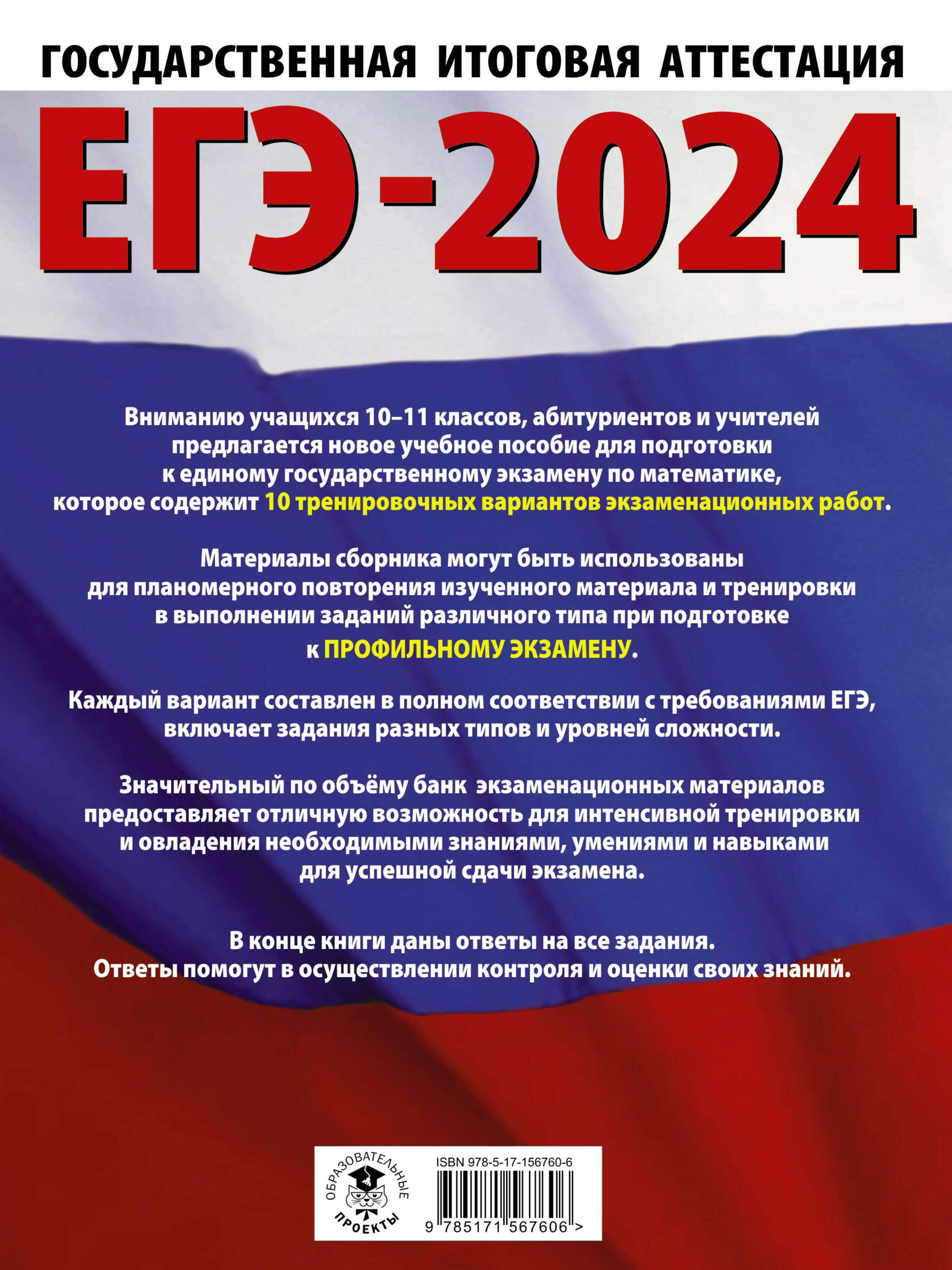 Вниманию учащихся 10-11 классов, абитуриентов и учителей предлагается новое учебное пособие для подготовки к единому государственному экзамену по математике, которое содержит 10 тренировочных вариантов экзаменационных работ. Материалы сборника могут быть использованы для планомерного повторения изученного материала и для тренировки в выполнении заданий различного типа при подготовке к ПРОФИЛЬНОМУ УРОВНЮ экзамена. Каждый вариант составлен в соответствии с требованиями ЕГЭ, включает задания разных типов и уровней сложности. Значительный по объёму банк экзаменационных материалов предоставляет отличную возможность для интенсивной тренировки и овладения необходимыми знаниями, умениями и навыками для успешной сдачи экзамена. В конце книги даны ответы на все задания. Ответы помогут в осуществлении контроля и самооценки своих знаний.