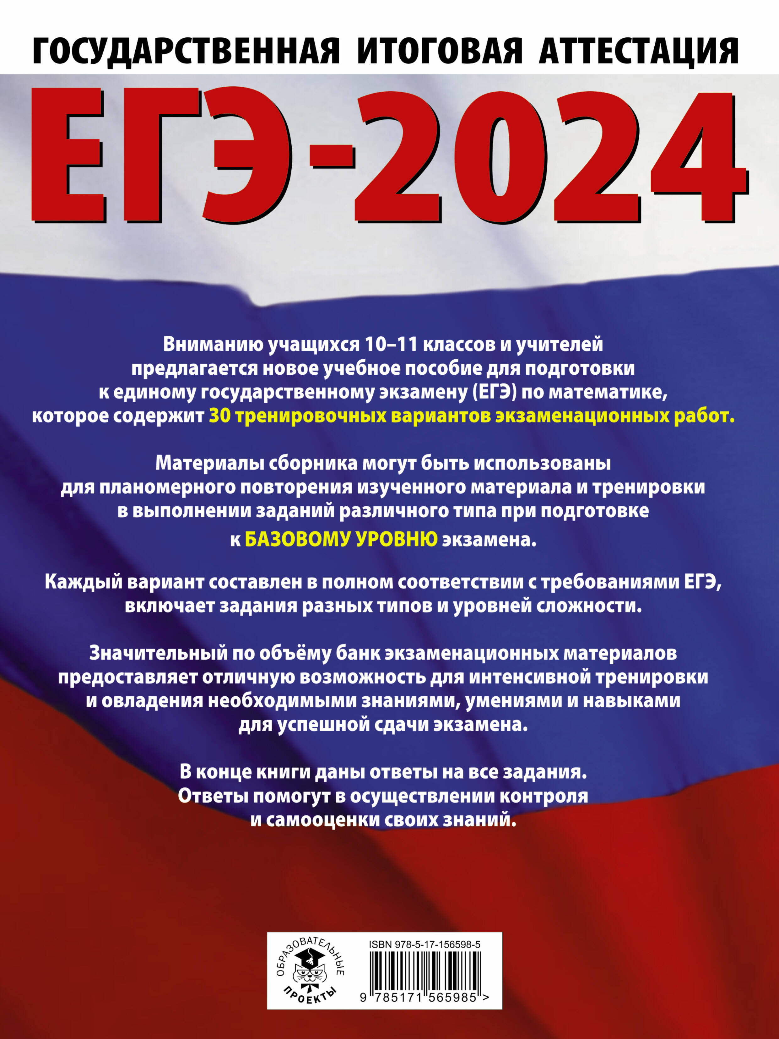 ЕГЭ-2024. Математика (60х84/8). 30 тренировочных вариантов экзаменационных работ для подготовки к единому государственному экзамену. Базовый уровень