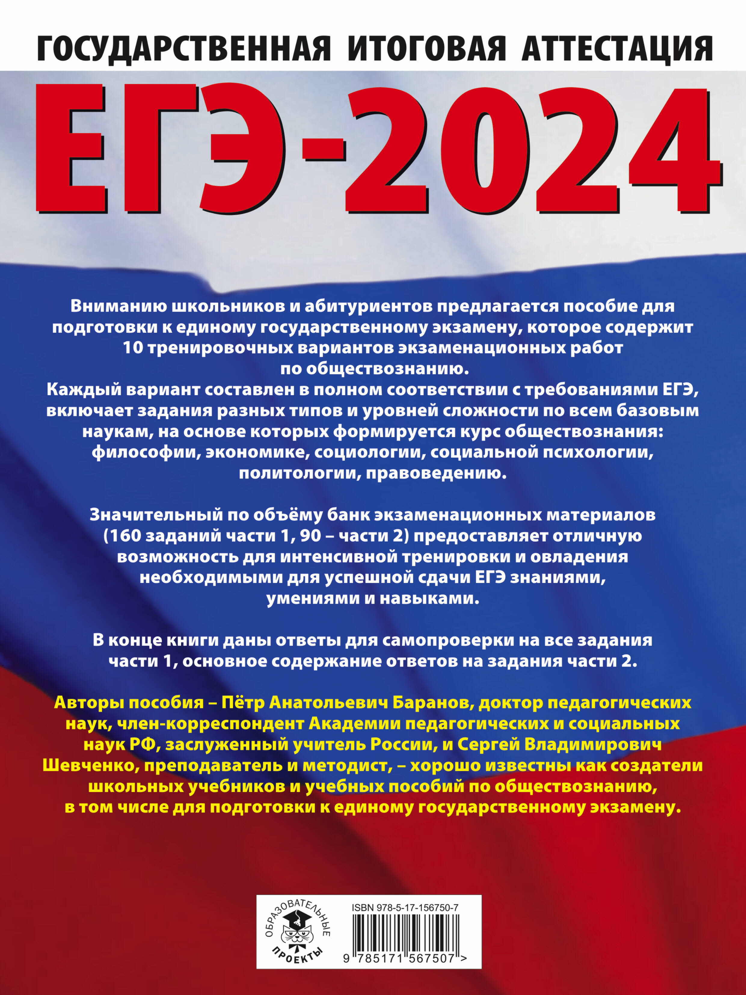 Вниманию школьников и абитуриентов предлагается пособие для подготовки к единому государственному экзамену, которое содержит 10 тренировочных вариантов экзаменационных работ по обществознанию. Каждый вариант составлен в полном соответствии с требованиями ЕГЭ, включает задания разных типов и уровней сложности по всем базовым наукам, на основе которых формируется курс обществознания: философии, экономике, социологии, социальной психологии, политологии, правоведению. Значительный по объёму банк экзаменационных материалов (160 заданий части 1, 90 - части 2) предоставляет отличную возможность для интенсивной тренировки и овладения необходимыми для успешной сдачи ЕГЭ знаниями, умениями и навыками. В конце книги даны ответы для самопроверки на все задания части 1, основное содержание ответов на задания части 2. Авторы пособия - Пётр Анатольевич Баранов, доктор педагогических наук, член-корреспондент Академии педагогических и социальных наук РФ, заслужнный учитель России, и Сергей Владимирович Шевченко, преподаватель и методист, - хорошо известны как создатели школьных учебников и учебных пособий по обществознанию, в том числе для подготовки к единому государственному экзамену.