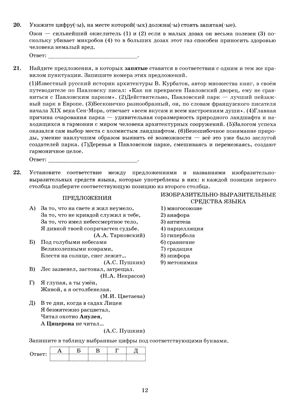 Авторы заданий - ведущие специалисты, принимающие непосредственное участие в разработке заданий ЕГЭ (Васильевых И. П., Гостева Ю. Н.) и методических материалов для подготовки к выполнению контрольных измерительных материалов ЕГЭ (Егораева Г. Т.). Пособие содержит 38 типовых вариантов экзаменационных заданий по русскому языку, а также тексты и задания, направленные на отработку навыков написания сочинения (часть 2). Все задания составлены с учетом особенностей и требований Единого государственного экзамена. Назначение пособия - дать читателям представление о структуре и содержании КИМ по русскому языку, степени сложности заданий. В сборнике также представлены: - ответы на типовые варианты экзаменационных заданий; - информация о текстах части 2; - комментарии к ответам; - образцы бланков, используемых на ЕГЭ для записи ответов. Пособие предназначено учителям для подготовки учащихся к Единому государственному экзамену по русскому языку, а также старшеклассникам для самостоятельной подготовки и самоконтроля.| Издательство | Экзамен |
