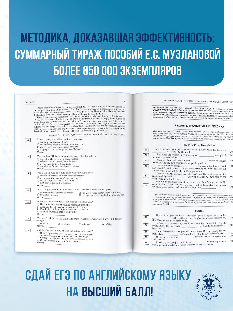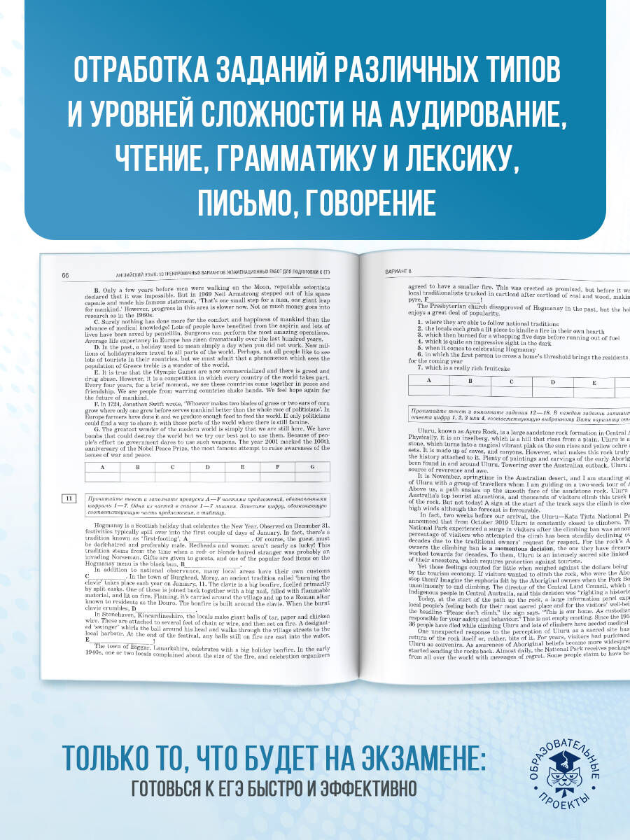 Вниманию школьников и абитуриентов предлагается пособие, позволяющее в кратчайшие строки успешно подготовиться к сдаче единого государственного экзамена по английскому языку. Представленные варианты включают в себя все темы, предусмотренные кодификатором ЕГЭ по английскому языку. В каждом блоке - разделы "Аудирование", "Чтение", "Грамматика и лексика", "Письмо", в которые вошли экзаменационные задания всех типов и упражнения для отработки необходимых навыков. Задания и тексты для устной части экзамена даны в приложениях. Сборник содержит 10 полноценных тренировочных вариантов, соответствующих параметрам ЕГЭ, тексты для аудирования и ключи-ответы к заданиям. К разделу "Аудирование" на сайте по ссылке https://ast.ru/englishaudio/ размещены фонограммы текстов для прослушивания. Автор-составитель пособия - Елена Сергеевна Музланова - опытный учитель и официальный эксперт ЕГЭ и ОГЭ по английскому языку, создатель многих популярных пособий для подготовки к экзамену, лауреат премии Президента России.| Издательство | Издательство "АСТ" |