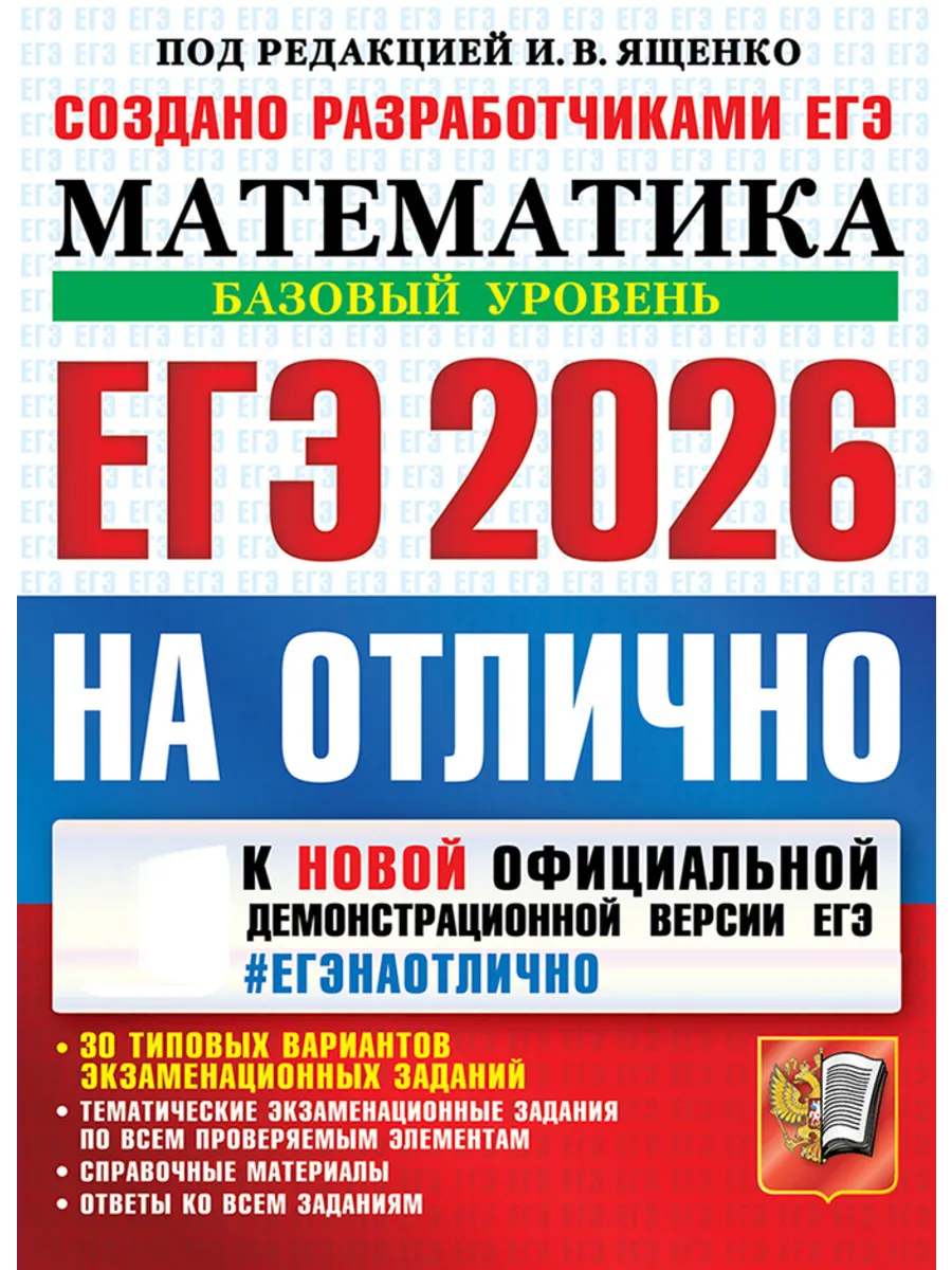 ЕГЭ 2026 НА ОТЛИЧНО. МАТЕМАТИКА. БАЗОВЫЙ УРОВЕНЬ. 30 типовых вариантов экзаменационных заданий. Тематические экзаменационные задания по всем проверяемым элементам. Инструкция по выполнению работы. Справочные материалы. Бланки ответов. Ответы ко всем заданиям.| Издательство | Издательство «Экзамен» |