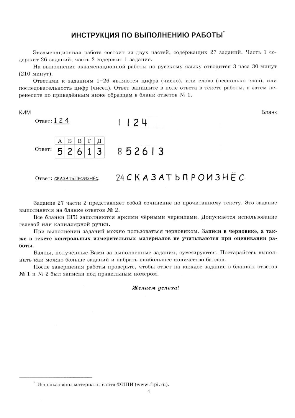 Пособие содержит 10 типовых вариантов экзаменационных заданий по русскому языку. Все задания составлены с учётом особенностей и требований Единого государственного экзамена, полностью соответствуют демоверсии, спецификации и кодификатору ЕГЭ по русскому языку, опубликованным на сайте ФИПИ. Назначение пособия - дать читателям представление о структуре и содержании КИМ по русскому языку, степени трудности заданий. В сборнике даны ответы ко всем вариантам тестов. Кроме того, приведен комментарий к одному варианту, демонстрирующий алгоритм выполнения каждого задания. Пособие адресовано учащимся-старшеклассникам для самоподготовки и самоконтроля, а также учителям для подготовки учащихся к экзамену по русскому языку.| Издательство | Экзамен |