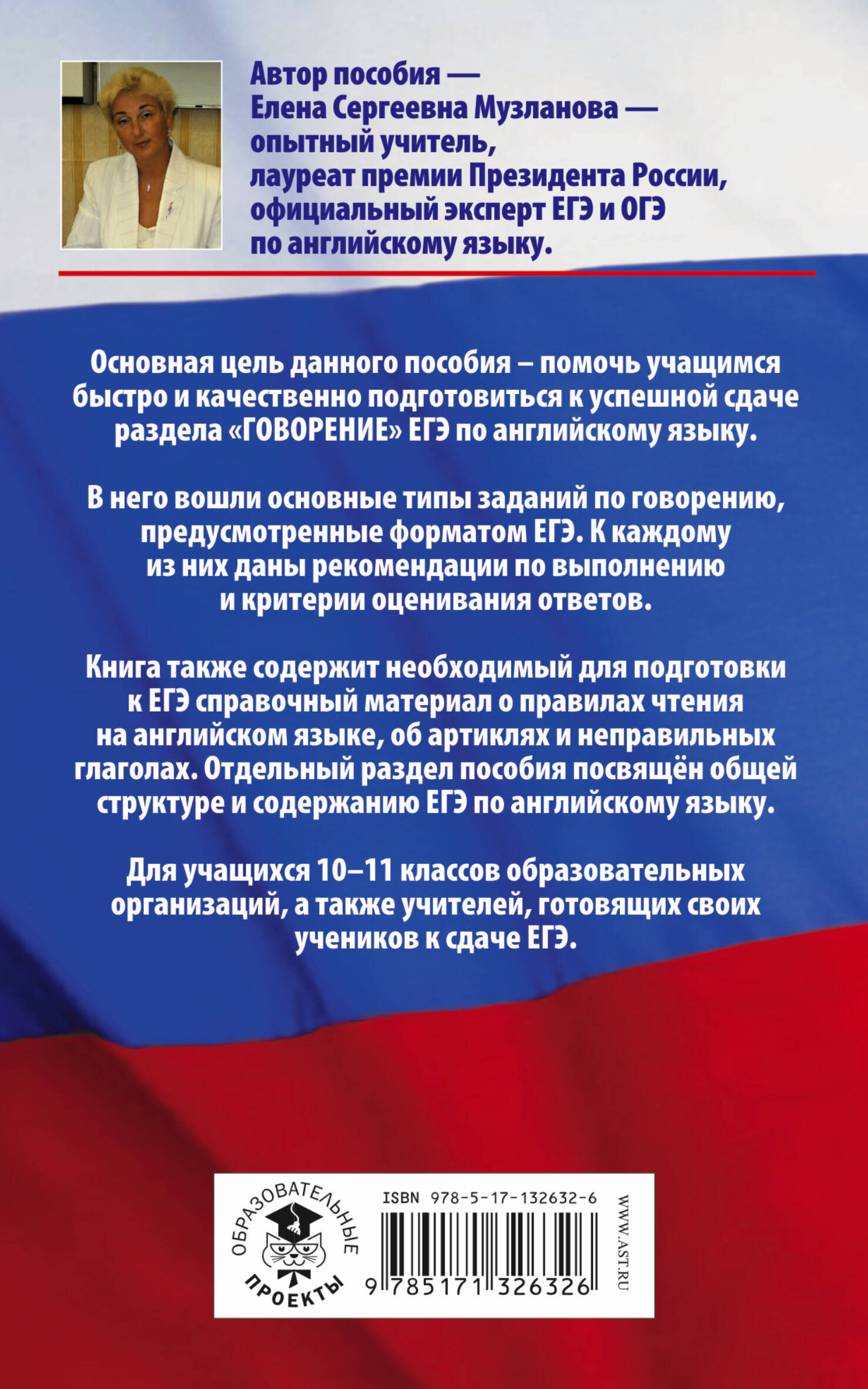 Основная цель данного пособия - помочь учащимся быстро и качественно подготовиться к успешной сдаче раздела "Говорение" ЕГЭ по английскому языку. В него вошли основные типы заданий по говорению, предусмотренные форматом ЕГЭ. К каждому из них даны рекомендции по выполнению и критерии оценивания ответов. Книга также содержит необходимый для подготовки к ЕГЭ справочный материал о правилах чтения на английском языке, об артиклях и неправильных глаголах. Отдельный раздел пособия посвящен общей структуре и содержанию ЕГЭ по английскому языку. Пособие предназначено главным образом для учащихся 10-11-х классов образовательных организаций, однако может быть использовано и на более раннем этапе обучения. Книга будет такжэе полезна и учителям, которые найдут в ней необходимый материал для своей работы на уроках.| Издательство | Издательство "АСТ" |