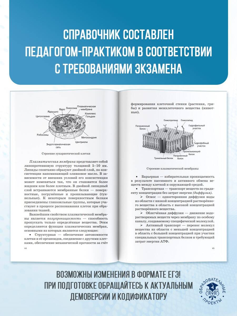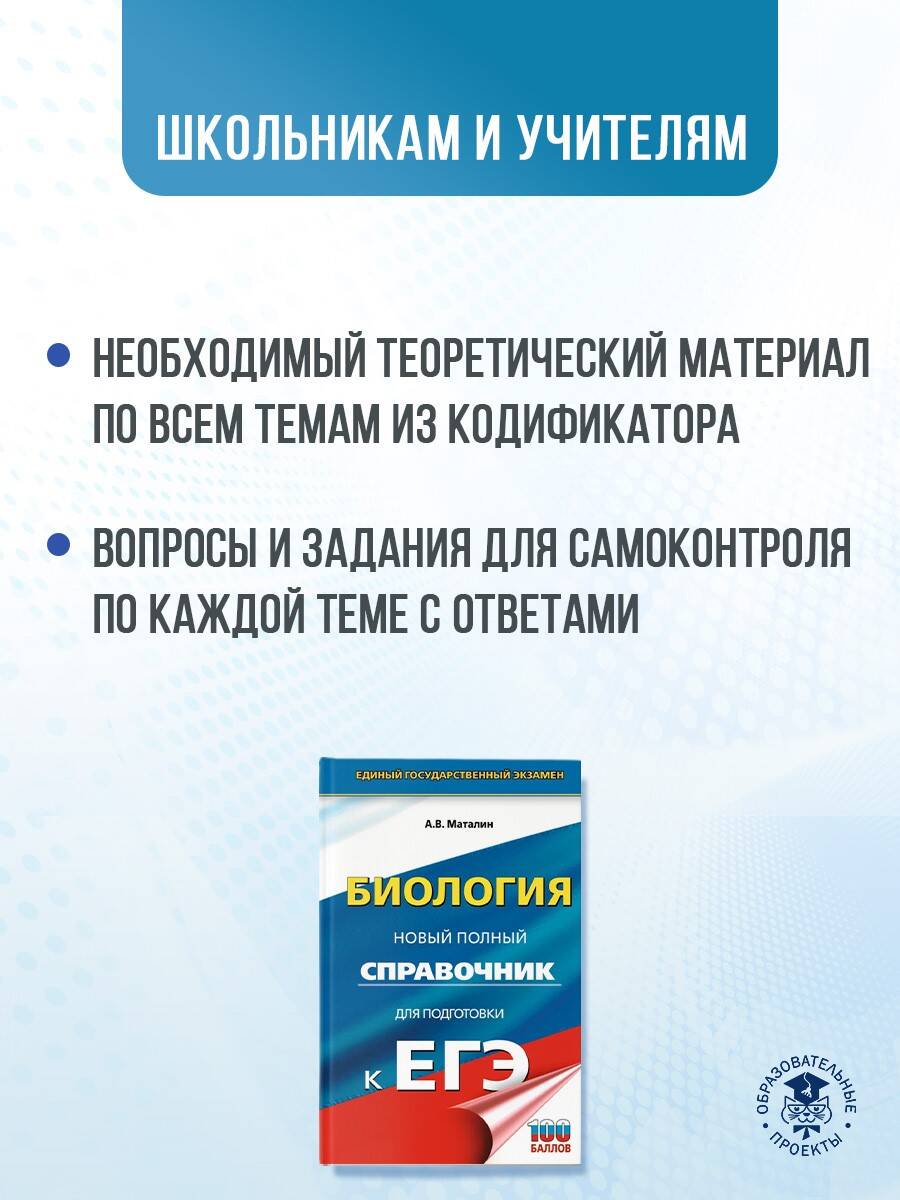Справочник содержит теоретический материал по курсу биологии и тестовые задания, необходимые для подготовки к Государственной итоговой аттестации (ЕГЭ) выпускников 11-х классов общеобразовательных учреждений. Теория курса изложена в краткой и доступной форме. Каждый раздел сопровождается примерами тестов. Они дают исчерпывающее представление о типах заданий экзаменационной работы и о степени их сложности. В конце пособия имеются ответы на все задания. Пособие может быть использовано учащимися для подготовки к ЕГЭ и самоконтроля, а учителями - для подготовки учащихся средней школы к итоговой аттестации по биологии. Книга адресована учащимся, учителям и методистам.| Издательство | Издательство "АСТ" |