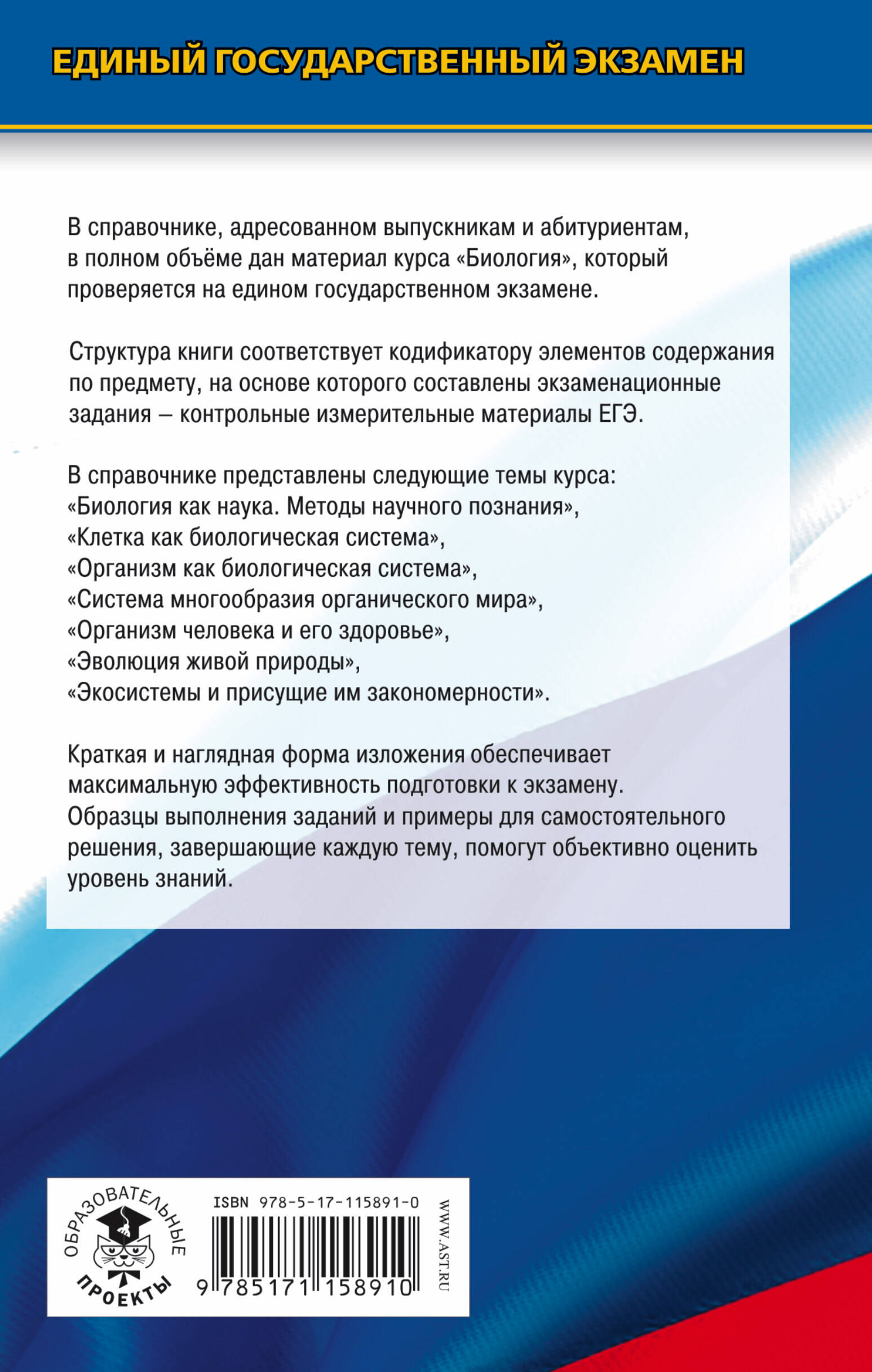 Вниманию учащихся и учителей предлагается новое учебное пособие, которое поможет успешно подготовиться к единому государственному экзамену по биологии. Справочник содержит весь теоретический материал по курсу биологии, необходимый для сдачи ЕГЭ. Он включает в себя все элементы содержания, проверяемые контрольно-измерительными материалами, и помогает обобщить и систематизировать знания и умения за курс средней (полной) школы. Теоретический материал изложен в краткой, доступной форме. Каждый раздел сопровождается примерами тестовых заданий, позволяющими проверить свои знания и степень подготовленности к аттестационному экзамену. Практические задания соответствуют формату ЕГЭ. В конце пособия приводятся ответы к тестам, которые помогут школьникам и абитуриентам проверить себя и восполнить имеющиеся пробелы. Пособие адресовано школьникам, абитуриентам и учителям.| Издательство | Издательство "АСТ" |