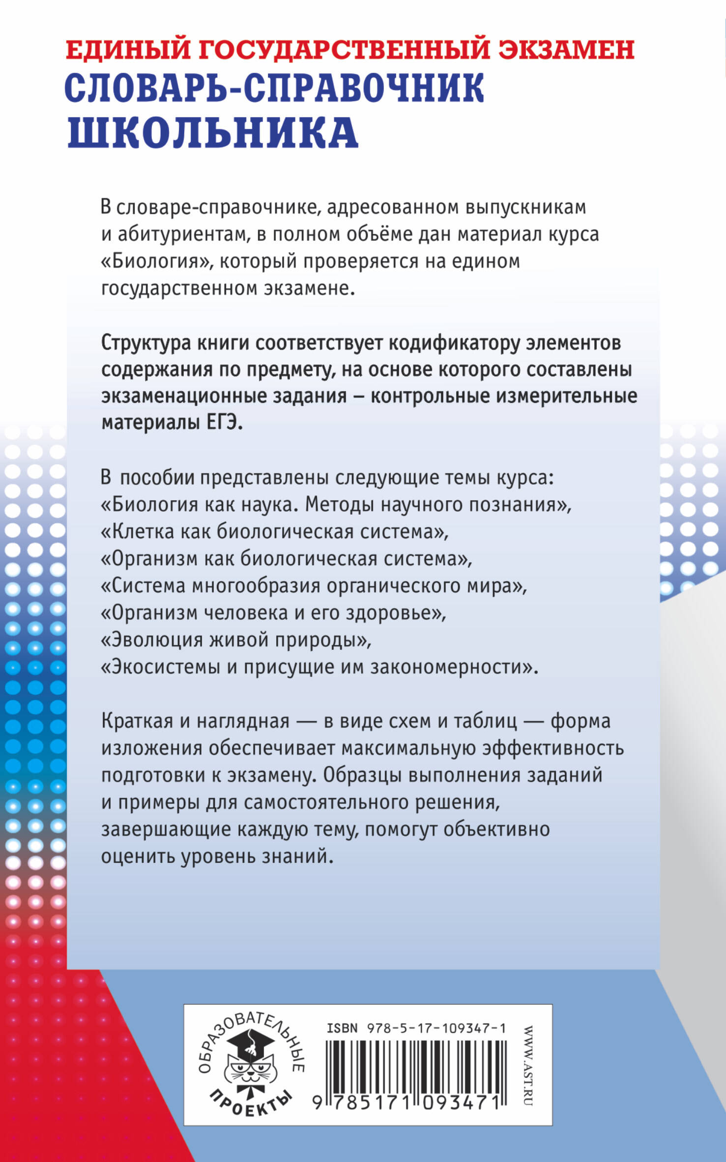 В словаре-справочнике, адресованном выпускникам и абитуриентам, в полном объёме дан материал курса «Биологии». Краткое и точное определение терминов и понятий, а также вопросы к темам, аналогичные вопросам экзаменационной работы ЕГЭ, и ответы к ним позволяют легко и быстро обобщить, систематизировать и повторить материал школьного курса биологии. Словарь-справочник окажет неоценимую помощь при подготовке к урокам, контрольным работам и промежуточной аттестации, в том числе и для подготовки к единому государственному экзамену.| Издательство | ИЗДАТЕЛЬСТВО "АСТ" |