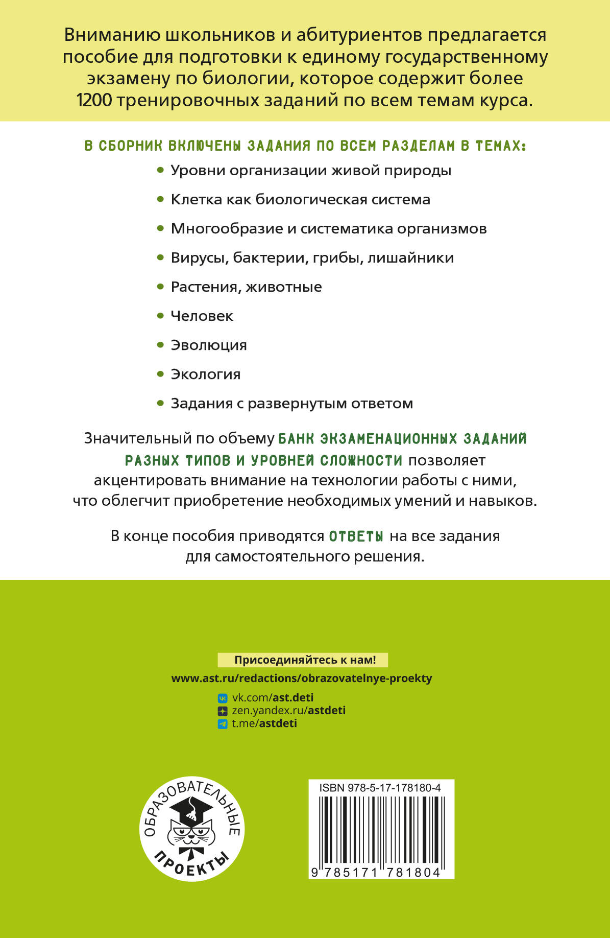 Вниманию школьников и абитуриентов предлагается пособие для подготовки к единому государственному экзамену по биологии, которое содержит более 1200 тренировочных заданий по всем темам курса. В сборник включены задания по всем разделам в темах: • Уровни организации живой природы • Клетка как биологическая система • Многообразие и систематика организмов • Вирусы, бактерии, грибы лишайники • Растения, животные • Человек • Эволюция • Экология • Задания с развернутым ответом Значительный по объему БАНК ЭКЗАМЕНАЦИОННЫХ ЗАДАНИЙ РАЗНЫХ ТИПОВ И УРОВНЕЙ СЛОЖНОСТИ позволяет акцентировать внимание на технологии работы с ними, что облегчит приобретение необходимых умений и навыков. В конце пособия приводятся ответы на все задания для самостоятельного решения.| Издательство | Издательство "АСТ" |