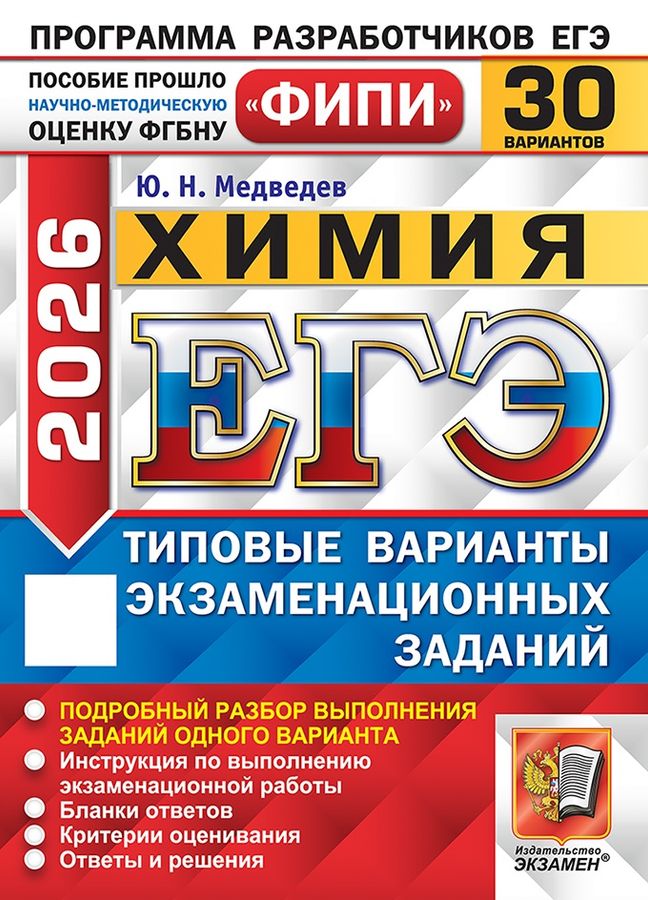 ЕГЭ 2026. ХИМИЯ. 30 ВАРИАНТОВ. ТИПОВЫЕ ВАРИАНТЫ ЭКЗАМЕНАЦИОННЫХ ЗАДАНИЙ. 30 вариантов заданий. Подробный разбор выполнения заданий одного варианта. Инструкция по выполнению экзаменационной работы. Бланки ответов. Критерии оценивания. Ответы и решения.| Издательство | Издательство «Экзамен» |
