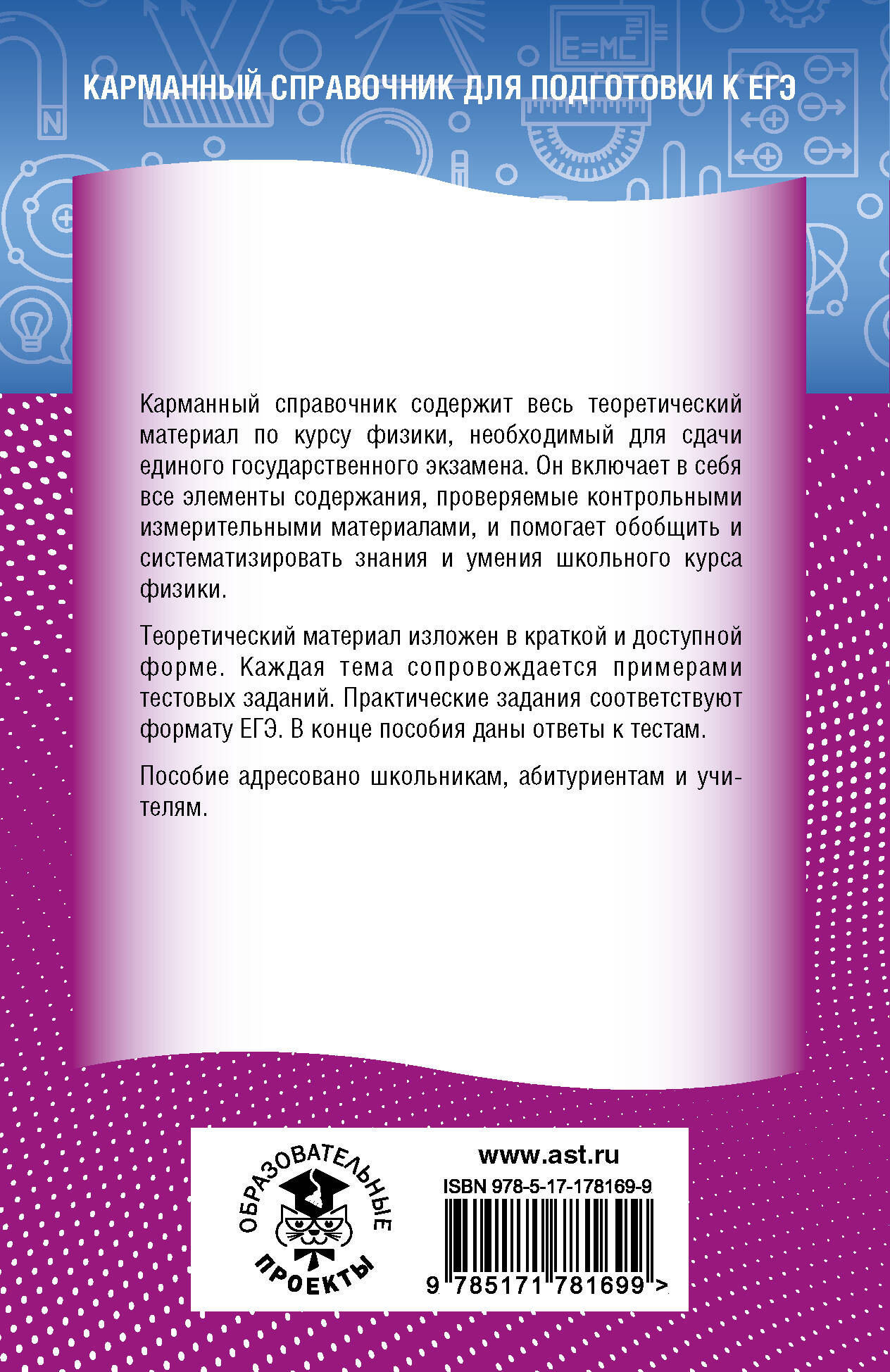 Карманный справочник содержит весь теоретический материал по курсу физики, необходимый для сдачи единого государственного экзамена. Он включает в себя все элементы содержания, проверяемые контрольными измерительными материалами, и помогает обобщить и систематизировать знания и умения школьного курса физики. Теоретический материал изложен в краткой и доступной форме. Каждая тема сопровождается примерами тестовых заданий. Практические задания соответствуют формату ЕГЭ. В конце пособия даны ответы к тестам. Пособие адресовано школьникам, абитуриентам и учителям.| Издательство | Издательство "АСТ" |