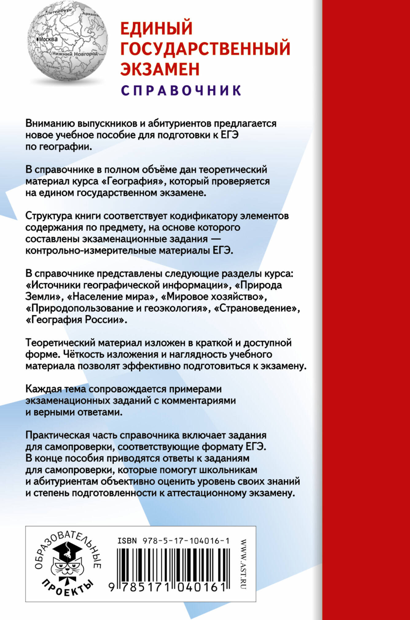Вниманию выпускников и абитуриентов предлагается новое учебное пособие для подготовки к ЕГЭ по географии. Справочник содержит в полном объеме теоретический материал по курсу географии, необходимый для сдачи ЕГЭ. Структура книги соответствует современному кодификатору элементов содержания по предмету, на основе которого составлены экзаменационные задания - контрольно-измерительные материалы (КИМ) ЕГЭ. Теоретический материал изложен в краткой, доступной форме. Каждая тема сопровождается примерами экзаменационных заданий с комментариями и ответами. Это поможет учителю организовать подготовку к единому государственному экзамену, а учащимся - самостоятельно проверить свои знания и готовность к сдаче выпускного экзамена. Практическая часть справочника включает задания для самопроверки, соответствующие формату ЕГЭ. В конце пособия приводятся ответы к заданиям для самопроверки, которые помогут школьникам и абитуриентам объективно оценить уровень своих знаний и степень подготовленности к аттестационному экзамену. Пособие адресовано старшим школьникам, абитуриентам и учителям.| Издательство | ИЗДАТЕЛЬСТВО "АСТ" |