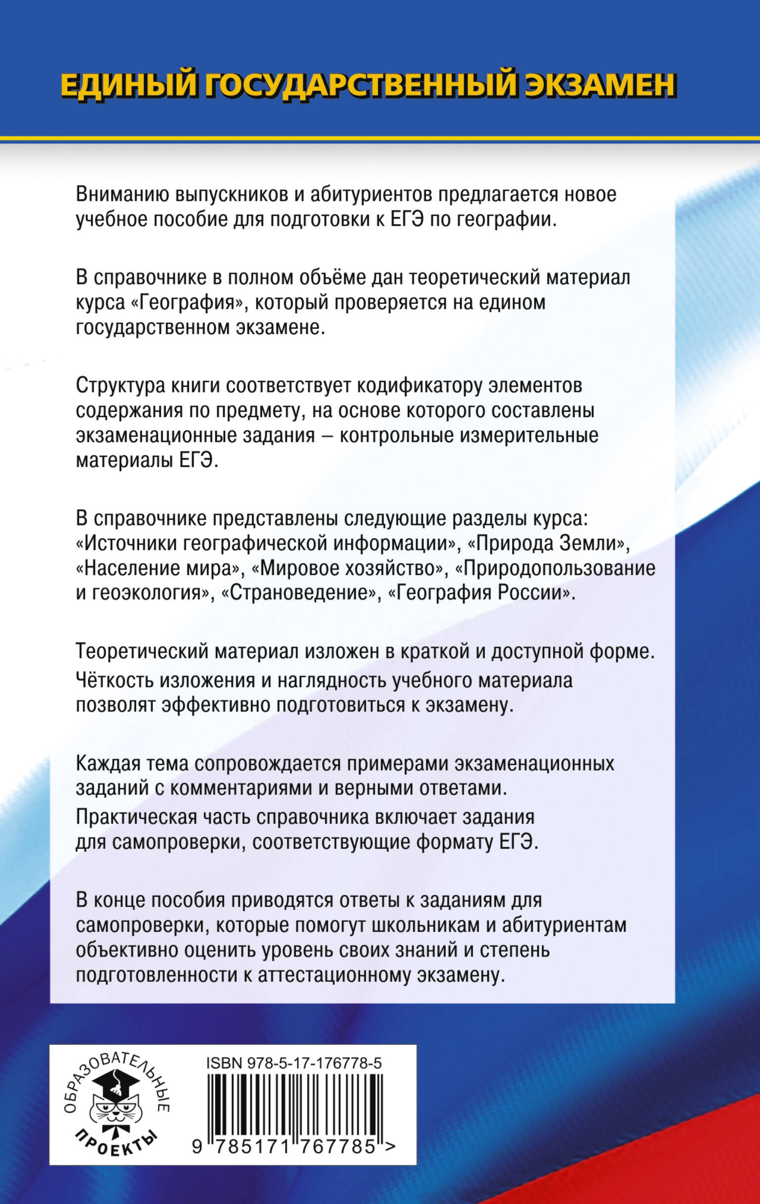 Справочник, адресованный выпускникам средней школы и абитуриентам, содержит весь теоретический материал курса географии, который проверяется на едином государственном экзамене. Структура книги соответствует современному кодификатору элементов содержания по предмету, на основе которого составлены экзаменационные задания - контрольные измерительные материалы (КИМ) ЕГЭ. Теоретический материал изложен в краткой, доступной форме. Каждая тема сопровождается примерами экзаменационных заданий с комментариями и ответами. Практическая часть справочника включает задания для самопроверки, соответствующие формату ЕГЭ. В конце пособия приводятся ответы к заданиям для самопроверки, которые помогут школьникам и абитуриентам объективно оценить уровень своих знаний и степень подготовленности к аттестационному экзамену.| Издательство | Издательство "АСТ" |
