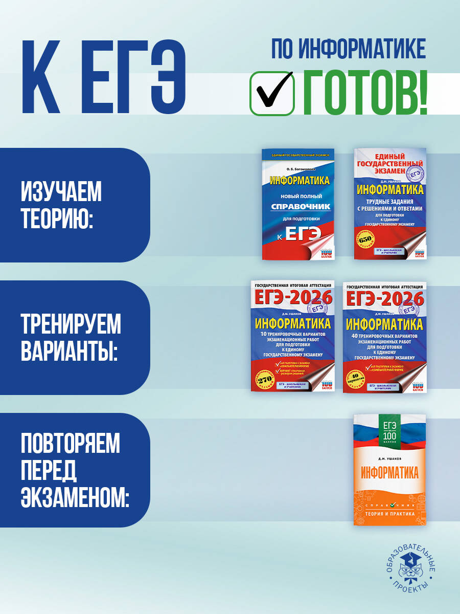 Справочник поможет школьнику освежить в памяти основной теоретический материал по всему курсу информатики за 7-11 классы, ознакомиться с принципами решения типовых задач, соответствующих демонстрационному варианту и спецификации ЕГЭ, и подготовиться к экзамену, проводимому в компьютерной форме. Для школьников, учителей информатики и методистов.| Издательство | Издательство "АСТ" |