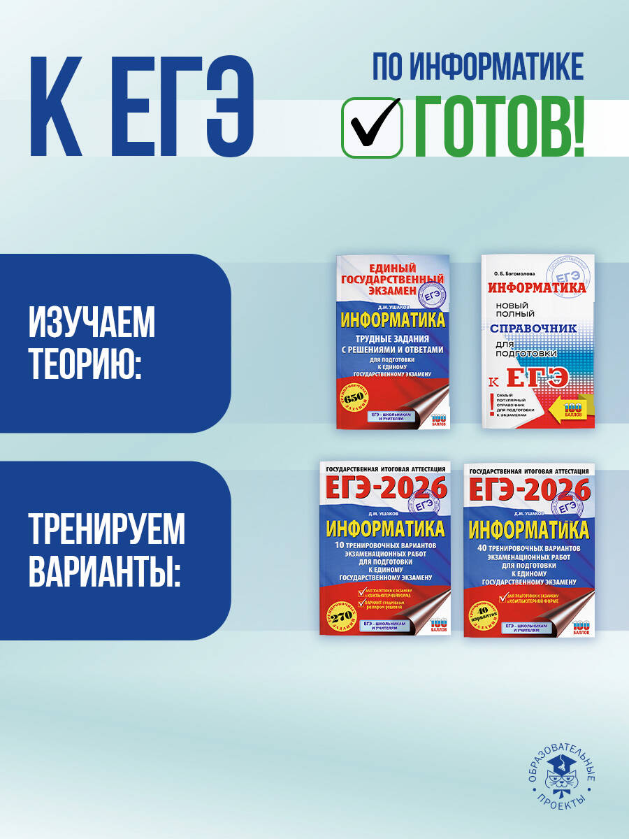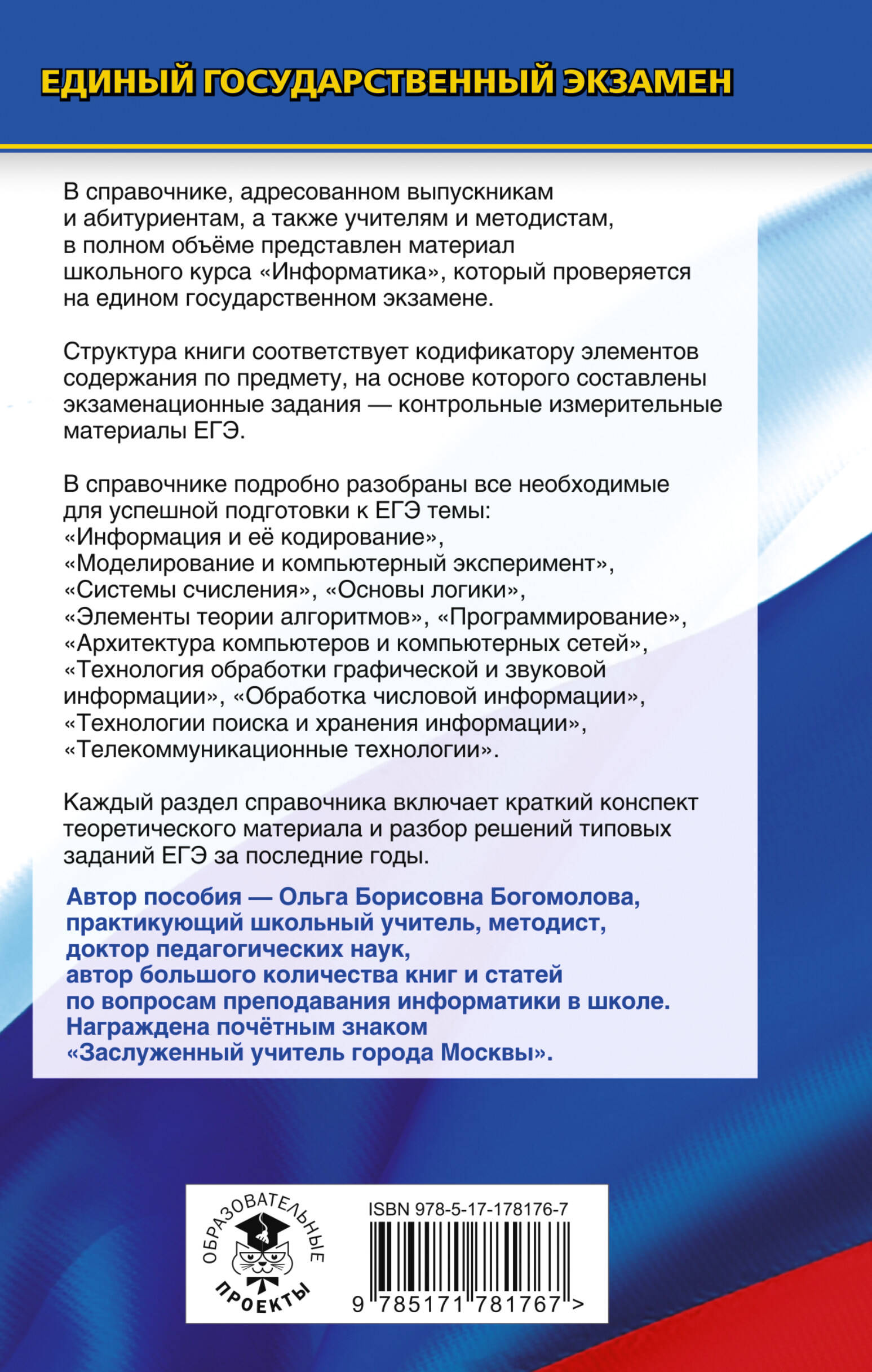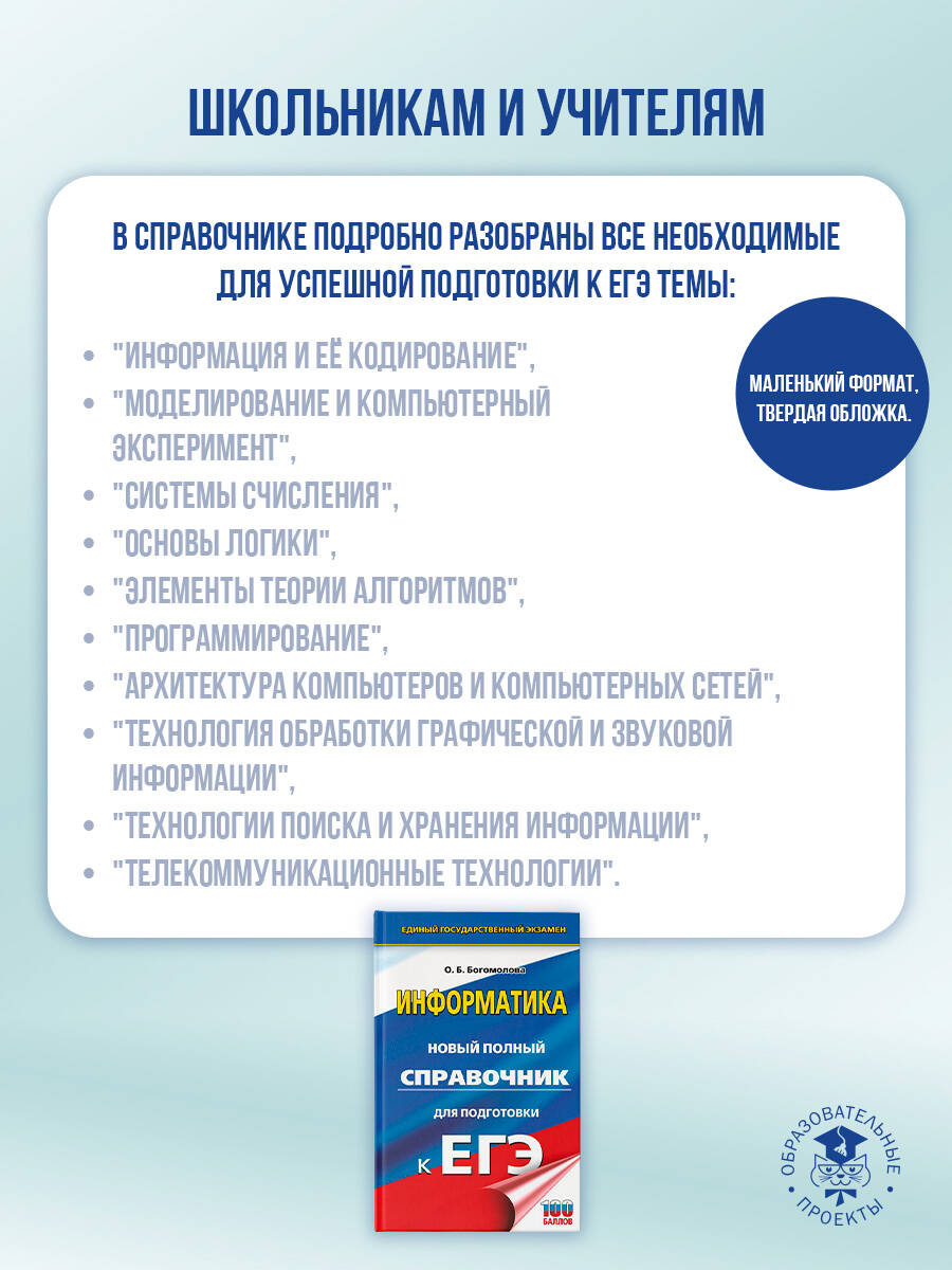 Справочник поможет школьнику освежить в памяти основной теоретический материал по всему курсу информатики за 7-11 классы, ознакомиться с принципами решения типовых задач, соответствующих демонстрационному варианту и спецификации ЕГЭ, и подготовиться к экзамену, проводимому в компьютерной форме. Для школьников, учителей информатики и методистов.| Издательство | Издательство "АСТ" |