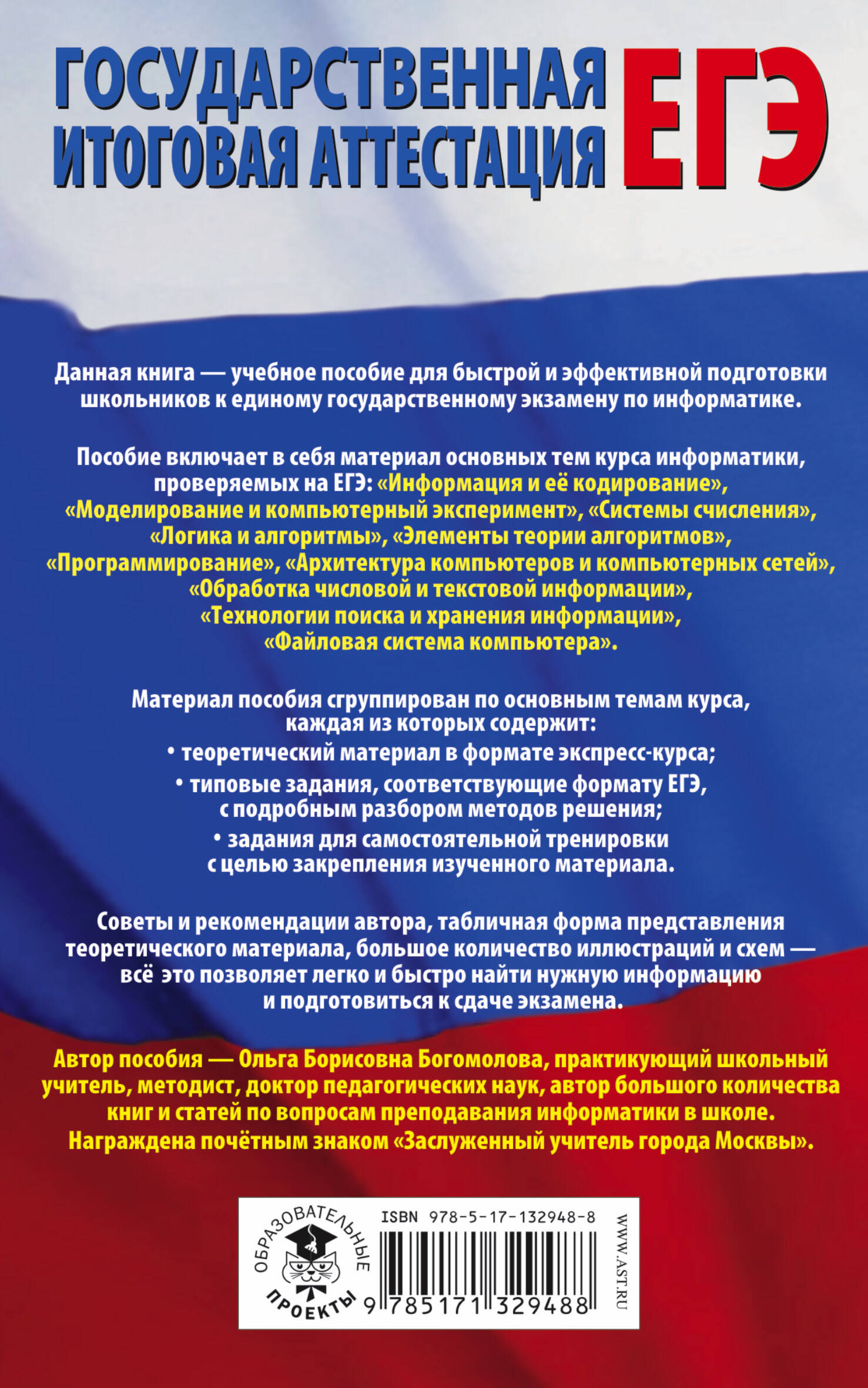 Пособие рассчитано на самостоятельную или под руководством учителя подготовку школьников к ЕГЭ. В него в полном объёме включён материал курса по информатике, который проверяется на экзамене. Теоретическая часть пособия представлена в краткой и доступной форме в виде экспресс-курса. Большое количество таблиц, схем и авторских методических рекомендаций позволяет легко и быстро сориентироваться в теме, найти и усвоить нужную информацию. В практическую часть включены разборы экзаменационных заданий и задачи для самостоятельной отработки с ответами в конце пособия.| Издательство | ИЗДАТЕЛЬСТВО "АСТ" |