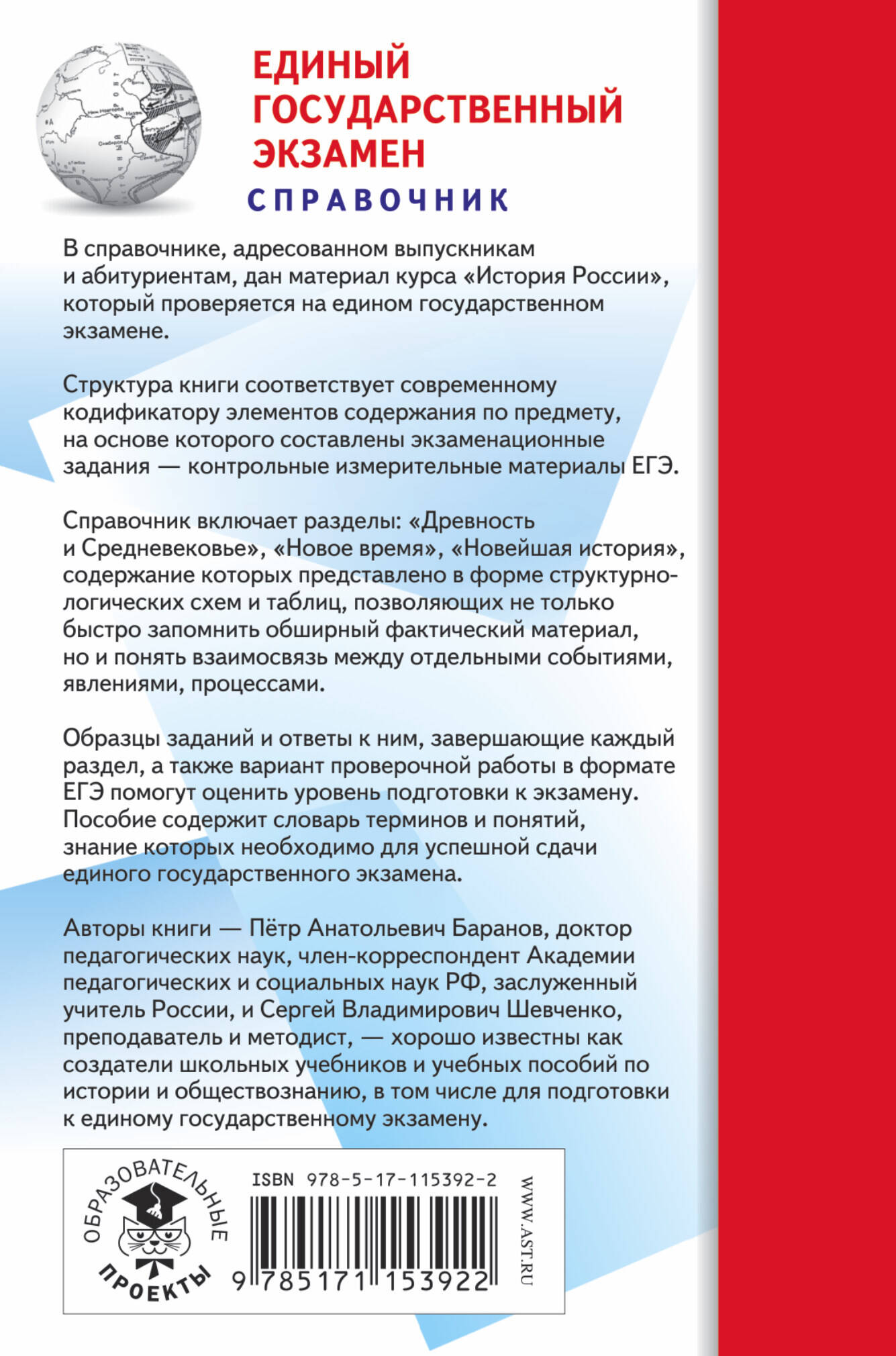 В справочнике, адресованном выпускникам и абитуриентам, дан материал курса «История России», который проверяется на едином государственном экзамене. Структура книги соответствует современному кодификатору элементов содержания по предмету, на основе которого составлены экзаменационные задания - контрольно-измерительные материалы (КИМ) ЕГЭ. Справочник включает три раздела: «Древность и Средневековье», «Новое время», «Новейшая история», содержание которых представлено в форме структурно-логических схем и таблиц, позволяющих не только быстро запомнить обширный фактический материал, но и понять взаимосвязь между отдельными событиями явлениями, процессами. Образцы заданий и ответы к ним, завершающие каждый раздел, а также вариант проверочной работы в формате ЕГЭ помогут оценить уровень подготовки к экзамену. Пособие содержит словарь терминов и понятий, знание которых необходимо для успешной сдачи единого государственного экзамена.| Издательство | Издательство "АСТ" |