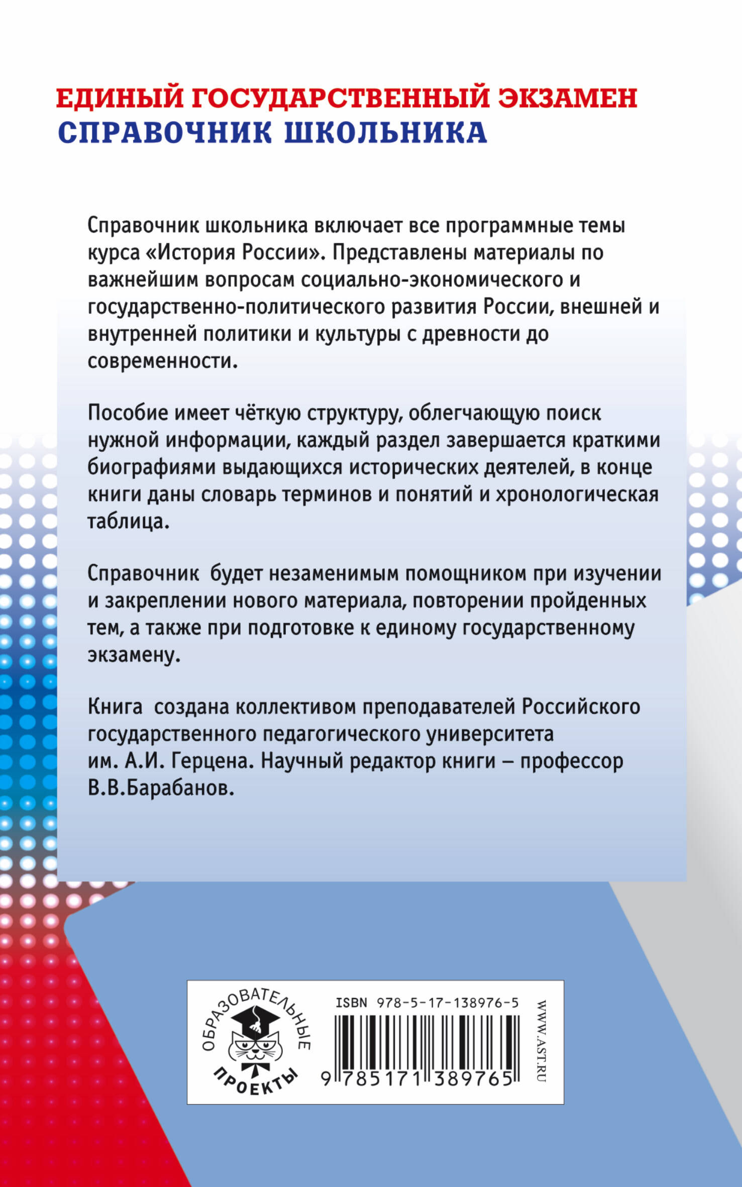 Справочник школьника включает все программные темы курса "История России".Представлены материалы по важнейшим вопросам социально-экономического и государственно-политического развития России, внешней и внутренней политики и культуры с древности до современности. Пособие имеет чёткую структуру, облегчающую поиск нужной информации, каждый раздел завершается краткими биографиями выдающихся исторических деятелей, в конце книги даны словарь терминов и понятий и хронологическая таблица. Справочник будет незаменимым помощником при изучении и закреплении нового материала, повторении пройденных тем, а также при подготовке к единому государственному экзамену. Книга создана коллективом преподавателей Российского государственного педагогического университета им. А.И. Герцена. Научный редактор книги - профессор В.В.Барабанов.| Издательство | АСТ |