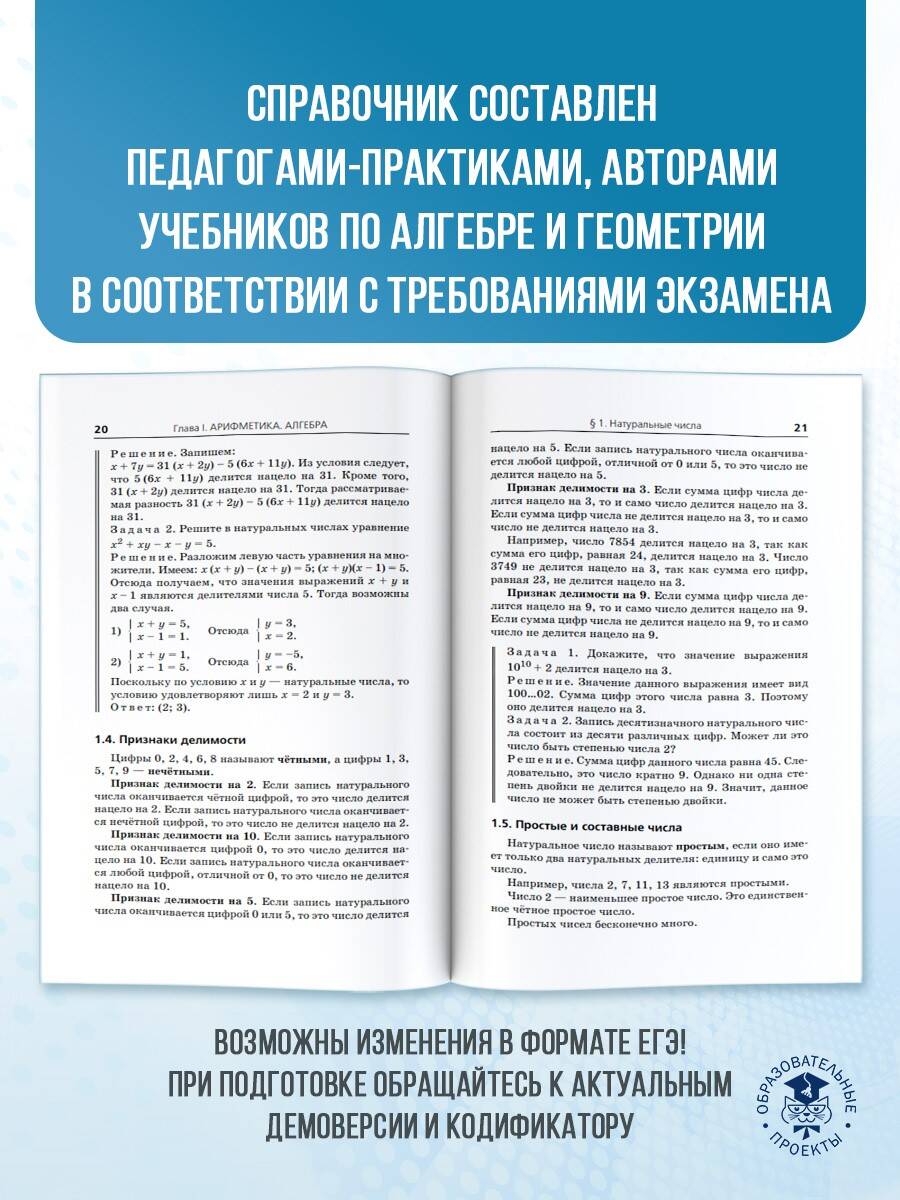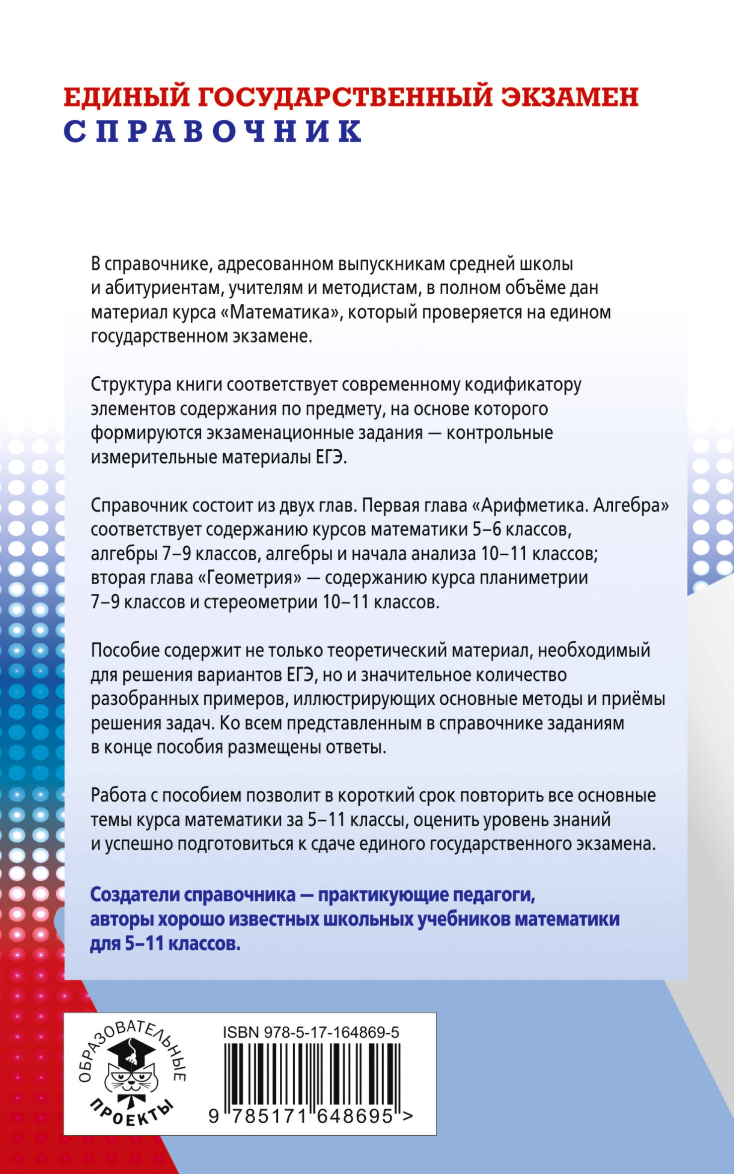 Справочник содержит материал курса "Математика" в объёме, проверяемом на едином государственном экзамене. Структура книги соответствует современному кодификатору элементов содержания по предмету, на основе которого формируются экзаменационные задания - контрольные измерительные материалы ЕГЭ. Справочник состоит из двух глав: "Арифметика. Алгебра" и "Геометрия". Помимо теоретического материала в справочнике представлено значительное количество разобранных примеров, иллюстрирующих основные методы и приёмы решения задач. Ко всем заданиям в конце пособия даны ответы для самопроверки. Работа с пособием позволит повторить все основные темы курса математики за 5-11 классы и успешно подготовиться к сдаче ЕГЭ.| Издательство | Издательство "АСТ" |