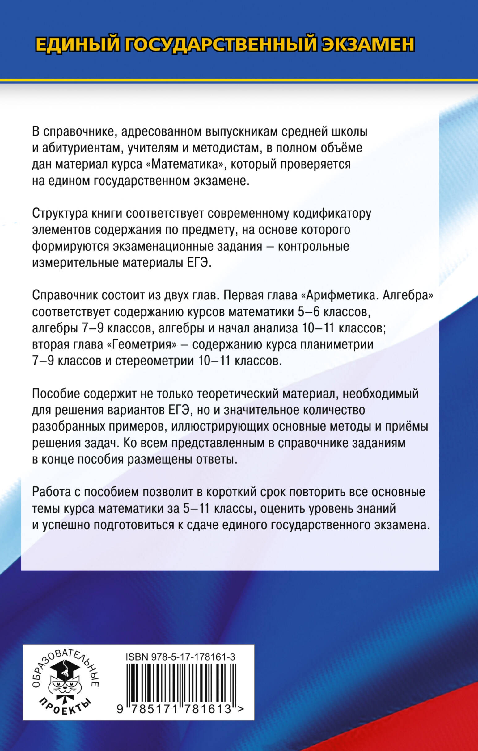 Справочник содержит материал курса "Математика" в объёме, проверяемом на едином государственном экзамене. Структура книги соответствует современному кодификатору элементов содержания по предмету, на основе которого формируются экзаменационные задания - контрольные измерительные материалы ЕГЭ. Справочник состоит из двух глав: "Арифметика. Алгебра" и "Геометрия". Помимо теоретического материала в справочнике представлено значительное количество разобранных примеров, иллюстрирующих основные методы и приёмы решения задач. Ко всем заданиям в конце пособия даны ответы для самопроверки. Работа с пособием позволит повторить все основные темы курса математики за 5-11 классы и успешно подготовиться к сдаче ЕГЭ.| Издательство | Издательство "АСТ" |