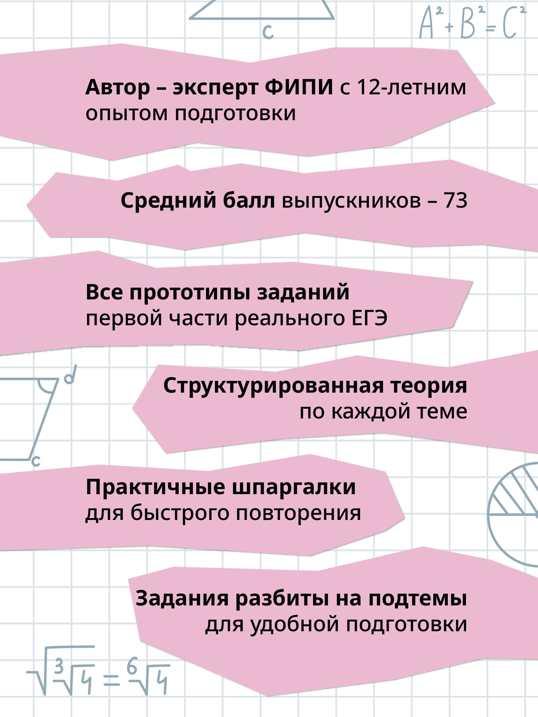 В этом пособии вы найдете: • все прототипы первой части, которые могут вам встретиться на реальном экзамене. Подборка собрана на основе задач ЕГЭ последних несколько лет. На экзамене вы гарантированно встретите прототипы из этого пособия; • каждое задание разбито на подтемы, так проще готовиться и нарешивать задачи. К каждому заданию дана короткая и структурированная теория для закрепления и повторения; • практичные шпаргалки, которые помогут быстро повторить формулы и ключевые темы перед экзаменом.| Издательство | Издательство "АСТ" |