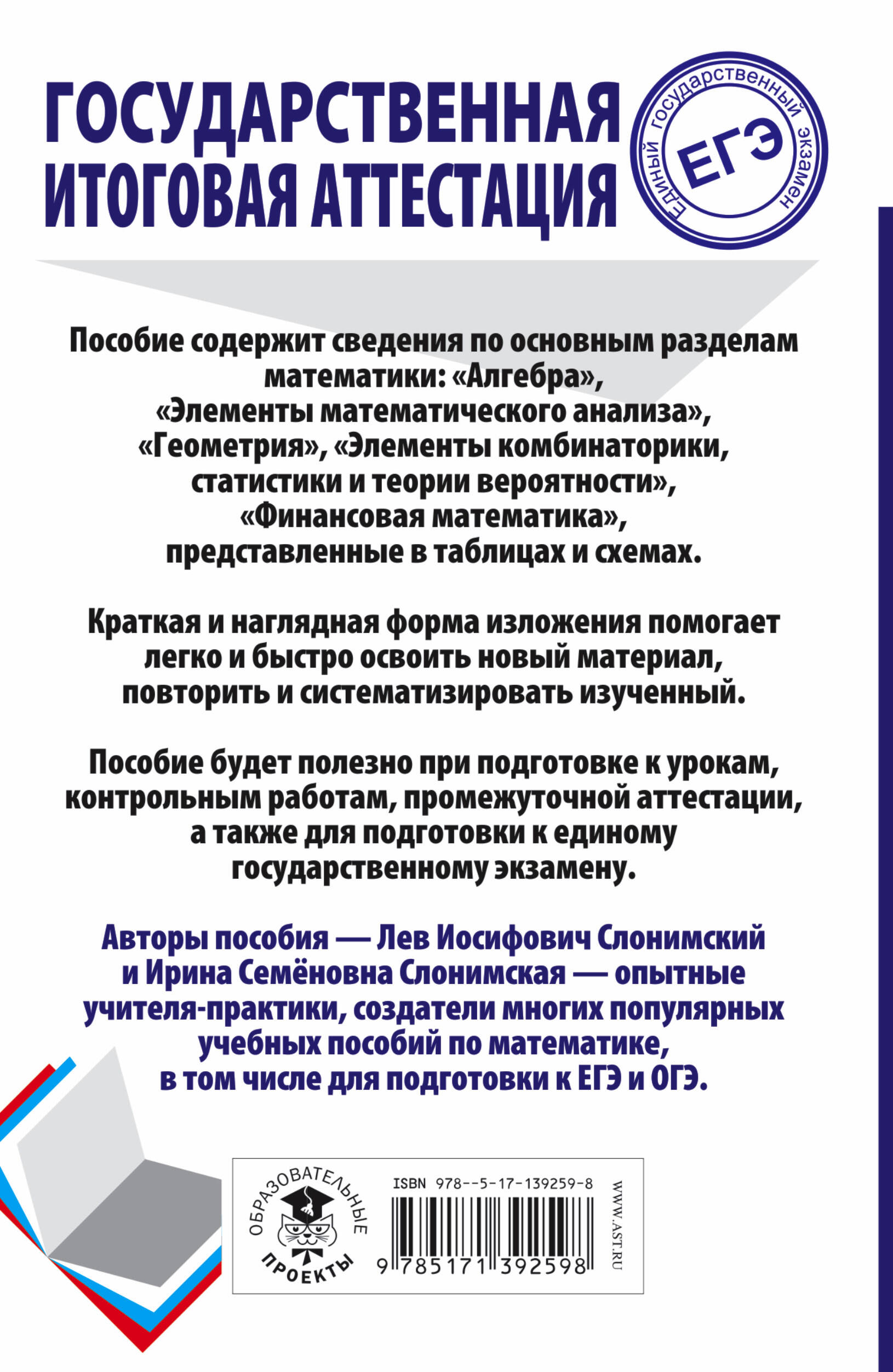 Пособие содержит сведения по основным разделам математики: "Алгебра", "Элементы математического анализа", "Геометрия", "Элементы комбинаторики, статистики и теории вероятности", "Финансовая математика", - представленные в таблицах и схемах. Краткая и наглядная форма изложения помогает легко и быстро освоить новый материал, повторить и систематизировать изученный. Пособие будет полезно при подготовке к урокам, контрольным работам, промежуточной аттестации, а также для подготовки к единому государственному экзамену. Авторы пособия - Лев Иосифович Слонимский и Ирина Семёновна Слонимская - опытные учителя-практики, создатели многих популярных учебных пособий по математике, в том числе для подготовки к ЕГЭ и ОГЭ.| Издательство | ИЗДАТЕЛЬСТВО "АСТ" |