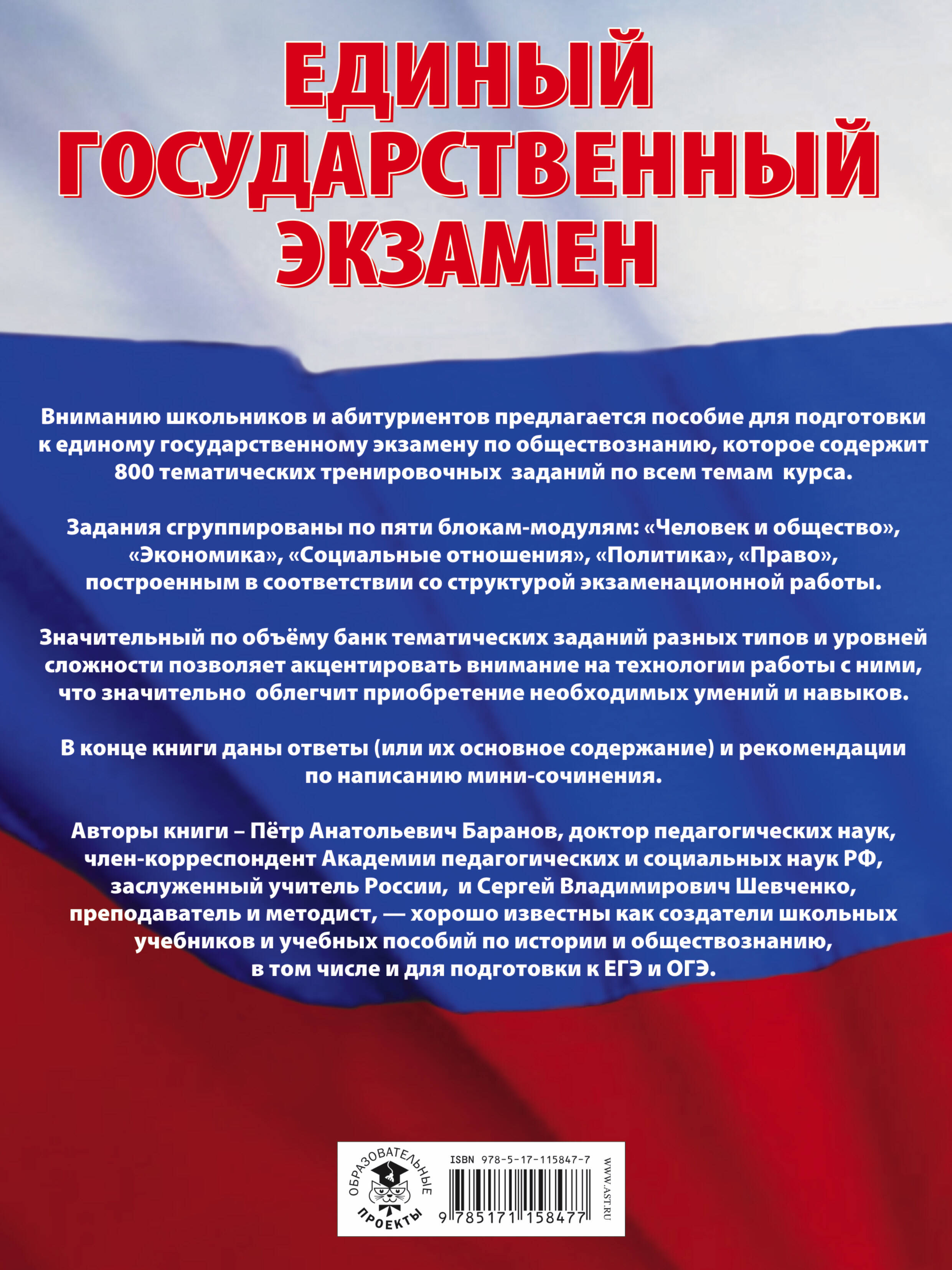 Вниманию школьников и абитуриентов предлагается пособие для подготовки к единому государственному экзамену по обществознанию, которое содержит 800 тематических тренировочных заданий по всем темам курса. Задания сгруппированы по пяти блокам-модулям: "Человек и общество", "Экономика", "Социальные отношения", "Политика", "Право", построенным в соответствии со структурой экзаменационной работы. Значительный по объёму банк тематических заданий разных типов и уровней сложности позволяет акцентировать внимание на технологии работы с ними, что значительно облегчит приобретение необходимых умений и навыков. В конце книги даны ответы (или их основное содержание) и рекомендации по написанию мини-сочинения.| Издательство | Издательство "АСТ" |