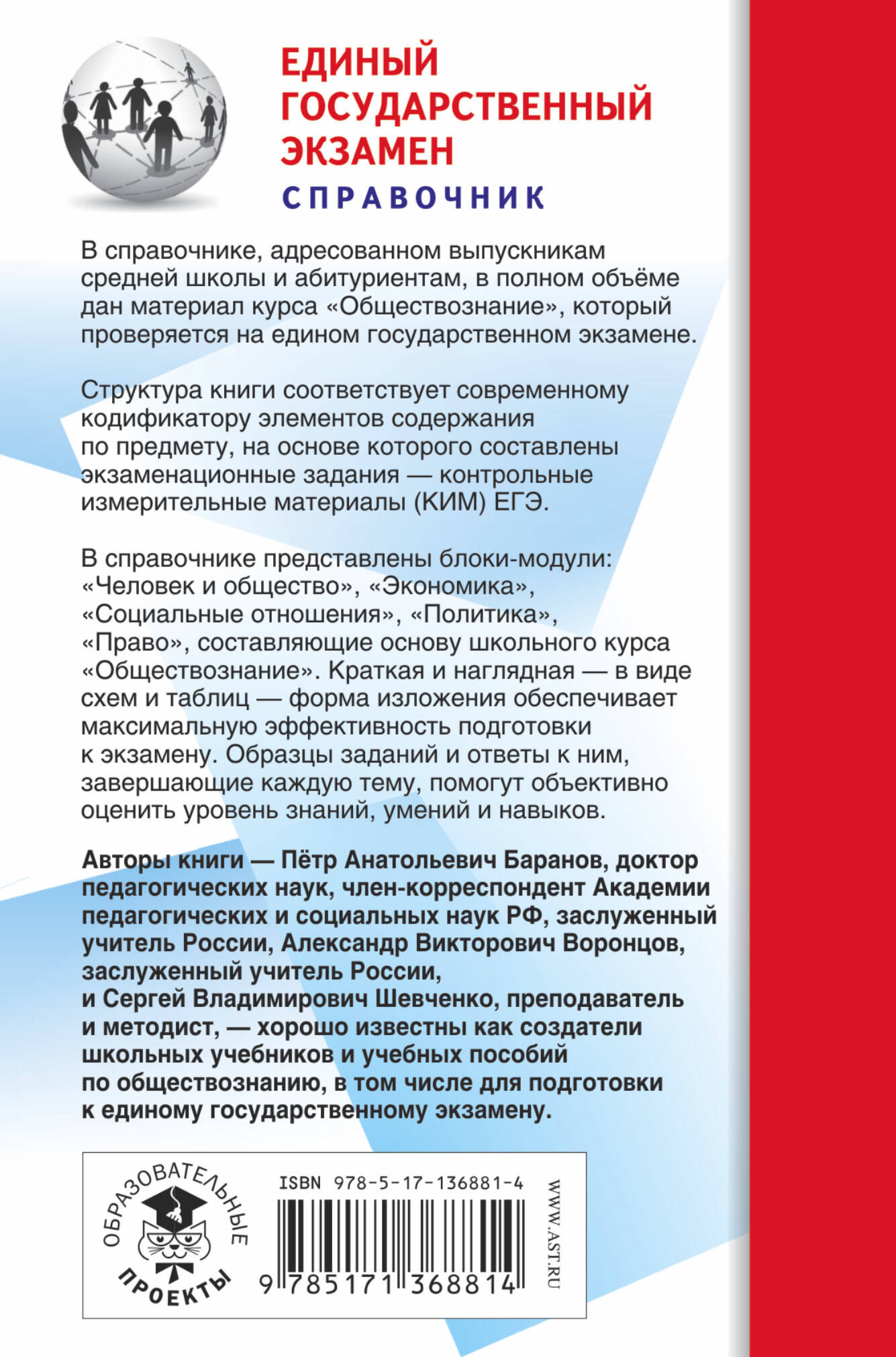 В справочнике, адресованном выпускникам средней школы и абитуриентам, в полном объёме дан материал курса "Обществознание", который проверятся на едином государственном экзамене. Структура книги соответствует современному кодификатору элементов содержания по предмету, на основе которого составлены экзаменационные задания - контрольно-измерительные материалы ЕГЭ (КИМы) В справочнике представлены блоки-модули "Человек и общество", "Экономика", "Социальные отношения", "Политика", "Право",составляющие основу школьного курса "Обществознание". Краткая и наглядная - в виде схем и таблиц - форма изложения обеспечивает максимальную эффективность подготовки к экзамену. Образцы заданий и ответы к ним, завершающие каждую тему, помогут объективно оценить уровень знаний, умений и навыков.| Издательство | ИЗДАТЕЛЬСТВО "АСТ" |