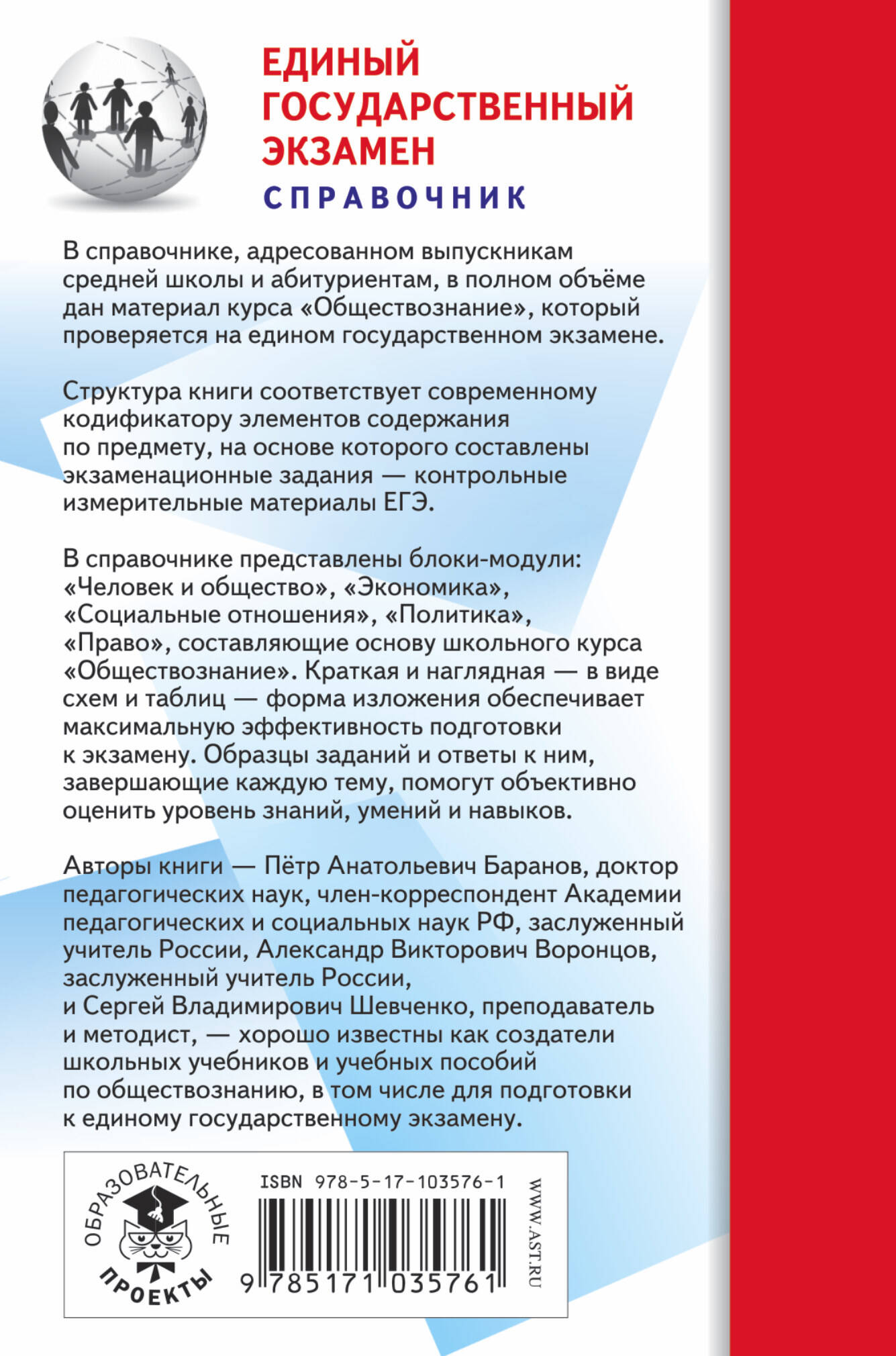 В справочнике, адресованном выпускникам средней школы и абитуриентам, в полном объёме дан материал курса "Обществознание", который проверятся на едином государственном экзамене. Структура книги соответствует современному кодификатору элементов содержания по предмету, на основе которого составлены экзаменационные задания - контрольно-измерительные материалы ЕГЭ (КИМы) В справочнике представлены блоки-модули "Человек и общество", "Экономика", "Социальные отношения", "Политика", "Право",составляющие основу школьного курса "Обществознание". Краткая и наглядная - в виде схем и таблиц - форма изложения обеспечивает максимальную эффективность подготовки к экзамену. Образцы заданий и ответы к ним, завершающие каждую тему, помогут объективно оценить уровень знаний, умений и навыков.| Издательство | Издательство "АСТ" |