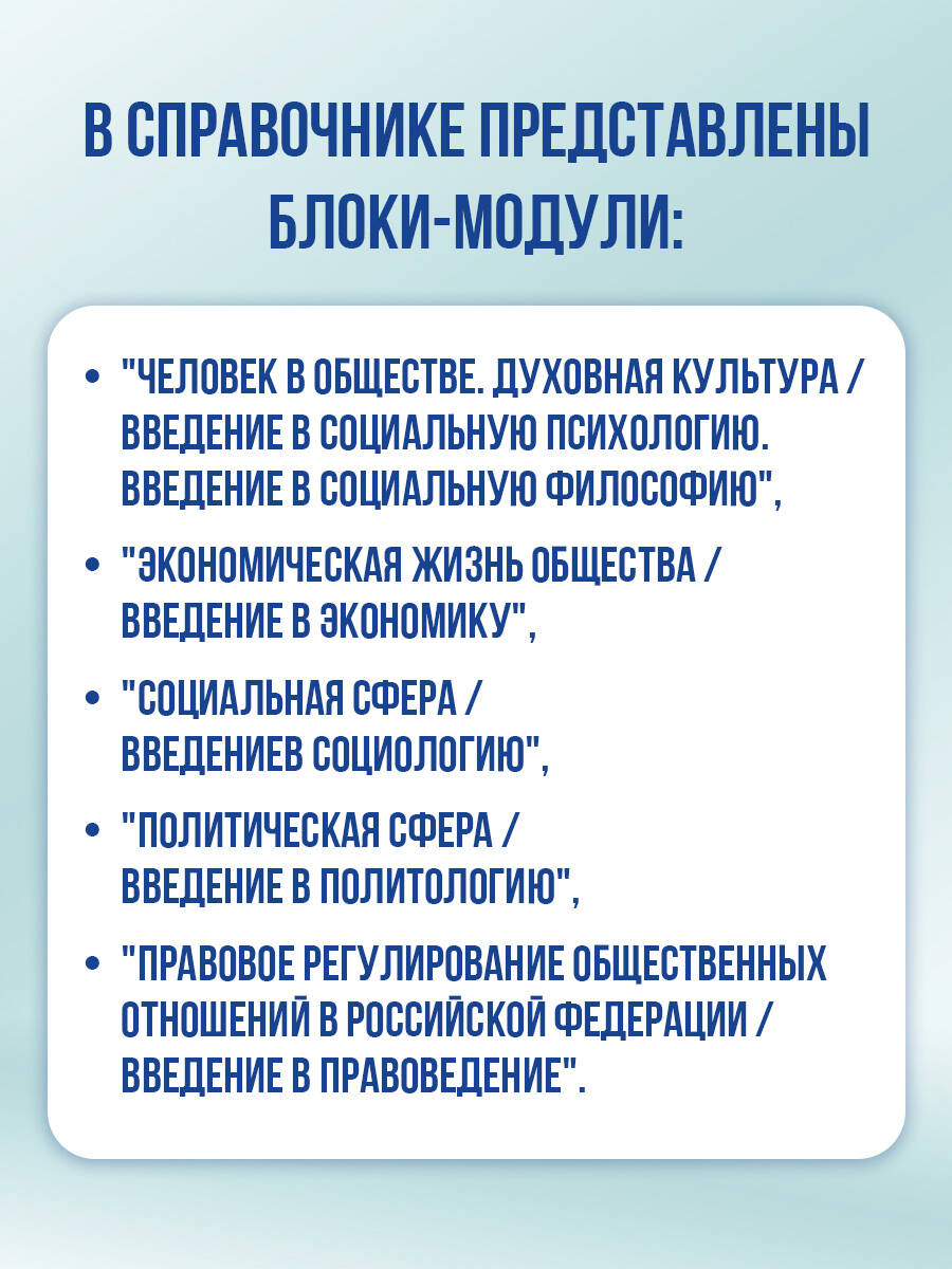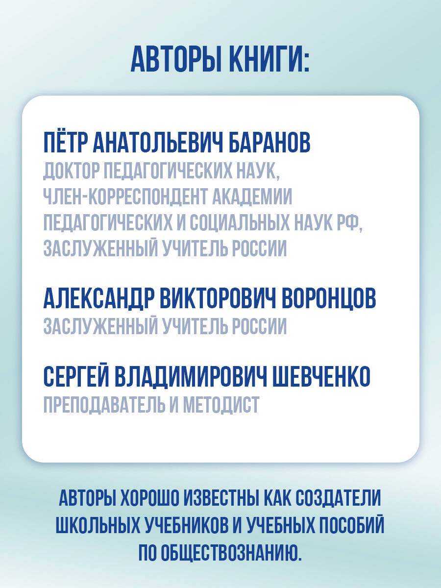 В справочнике, адресованном выпускникам средней школы и абитуриентам, в полном объеме дан материал курса "Обществознание", который проверяется на едином государственном экзамене. Структура книги соответствует современному кодификатору элементов содержания по предмету, на основе которого составлены экзаменационный заданий - контрольные измерительный материалы (КИМ) ЕГЭ. В справочнике представлены блоки-модули "Человек в обществе. Духовная культура / Введение в социальную психологию. Введение в социальную философию", "Экономическая жизнь общества / Введение в экономику", "Социальная сфера / Введение в социологию", "Политическая сфера / Введение в политологию", "Правовое регулирование общественных отношений в Российской Федерации / Введение в правоведение", составляющие основу школьного курса "Обществознание". Кратка и наглядная - в виде схем и таблиц - форма изложения обеспечивает максимальную эффективность подготовки к экзамену. Авторы книги - Пётр Анатольевич Баранов, доктор педагогических наук, член-корреспондент Академии педагогических и социальных наук РФ, заслуженный учитель России, Александр Викторович Воронцов, заслуженный учитель России, и Сергей Владимирович Шевченко, преподаватель и методист, - хорошо известны как создатели школьных учебников и учебных пособий по обществознанию, в том числе для подготовки к единому государственному экзамену.| Издательство | Издательство "АСТ" |