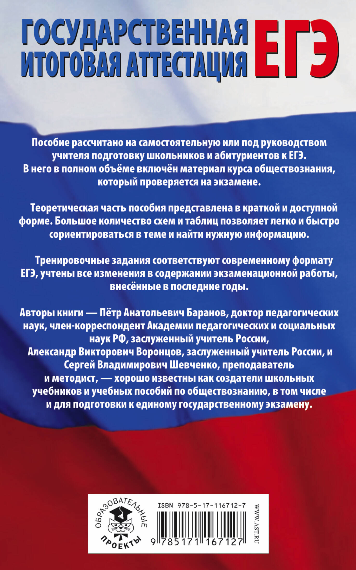 Пособие рассчитано на самостоятельную или под руководством учителя подготовку школьников и абитуриентов к ЕГЭ. В него в полном объёме включён материал курса обществознания, который проверяется на экзамене. Теоретическая часть пособия представлена в краткой и доступной форме. Большое количество схем и таблиц позволяет легко и быстро сориентироваться в теме и найти нужную информацию. Тренировочные задания соответствуют современному формату ЕГЭ, учтены все изменения в содержании экзаменационной работы, внесённые в последние годы. Авторы книги - Пётр Анатольевич Баранов, доктор педагогических наук, член-корреспондент Академии педагогических и социальных наук РФ, заслуженный учитель России, Александр Викторович Воронцов - заслуженный учитель России и Сергей Владимирович Шевченко - преподаватель и методист, хорошо известны как создатели школьных учебников и учебных пособий по обществознанию, в том числе и для подготовки к единому государственному экзамену.| Издательство | Издательство "АСТ" |