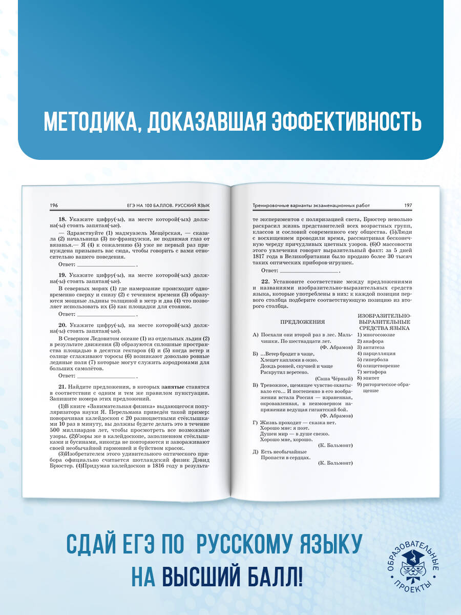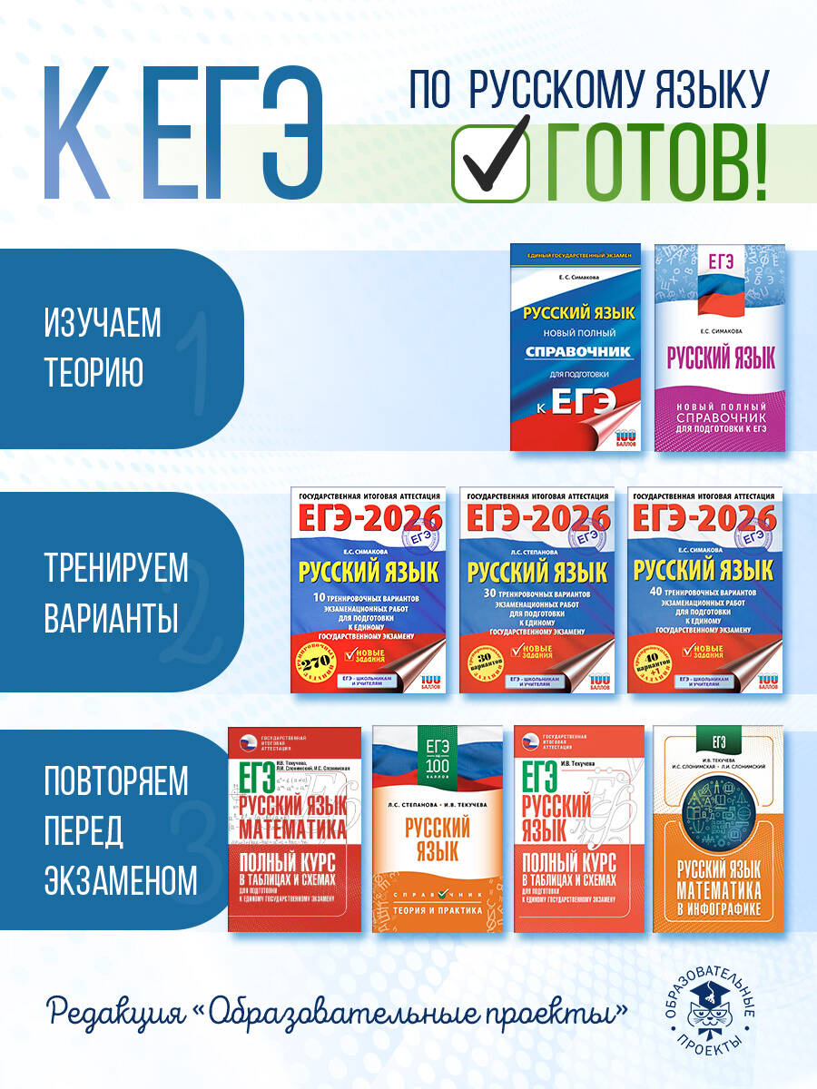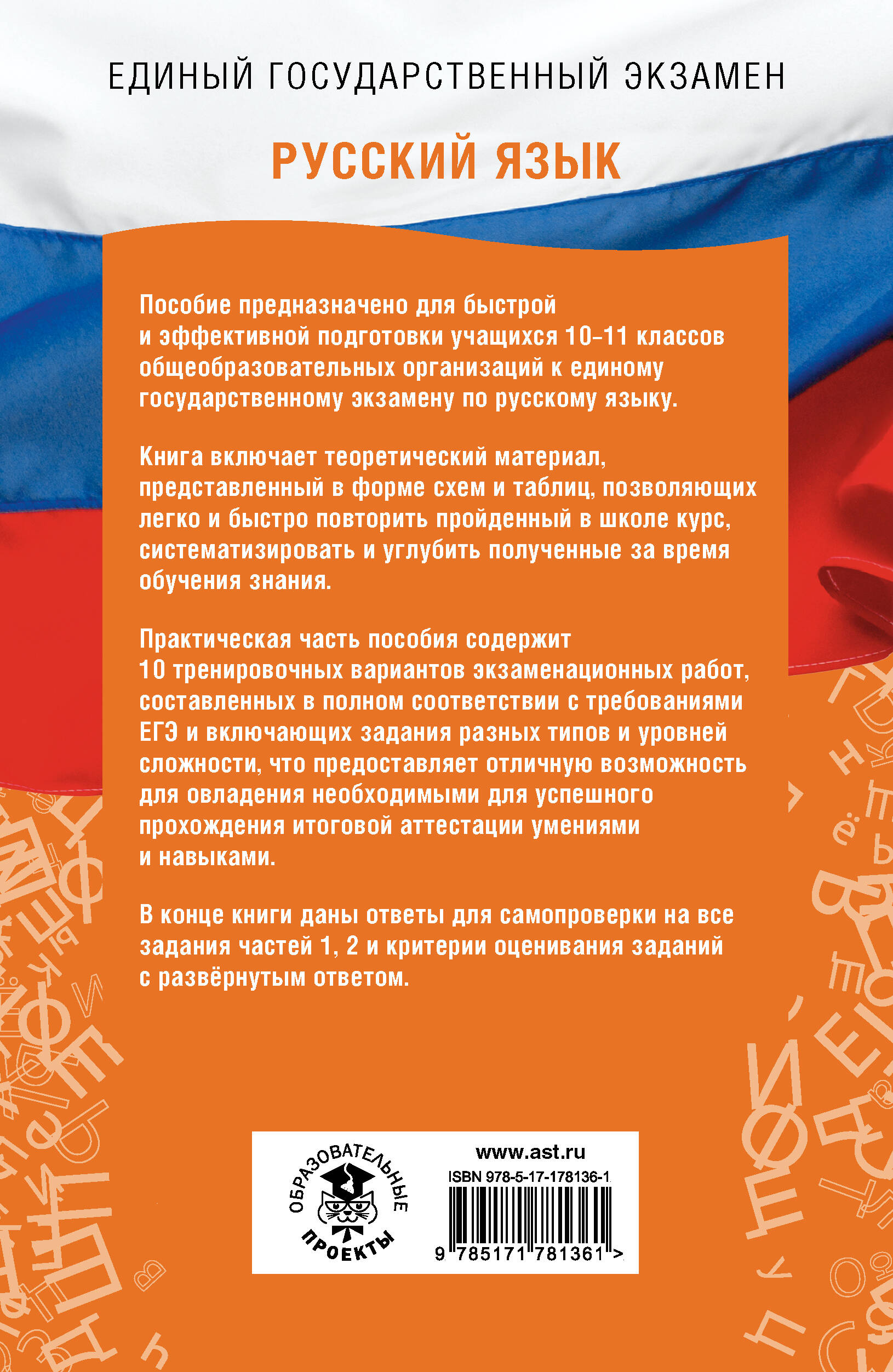 Пособие предназначено для быстрой и эффективной подготовки учащихся 10 - 11 классов общеобразовательных организаций к единому государственному экзамену по русскому языку. Книга включает теоретический материал, представленный в форме схем и таблиц, позволяющих легко и быстро повторить пройденный в школе курс, систематизировать и углубить полученные за время обучения знания. Практическая часть пособия содержит 10 тренировочных вариантов экзаменационных работ, составленных в полном соответствии с требованиями ЕГЭ и включающих задания разных типов и уровней сложности, что предоставляет отличную возможность для овладения необходимыми для успешного прохождения итоговой аттестации умениями и навыками. В конце книги даны ответы для самопроверки на все задания частей 1, 2 и критерии оценивания заданий с развёрнутым ответом.| Издательство | Издательство "АСТ" |