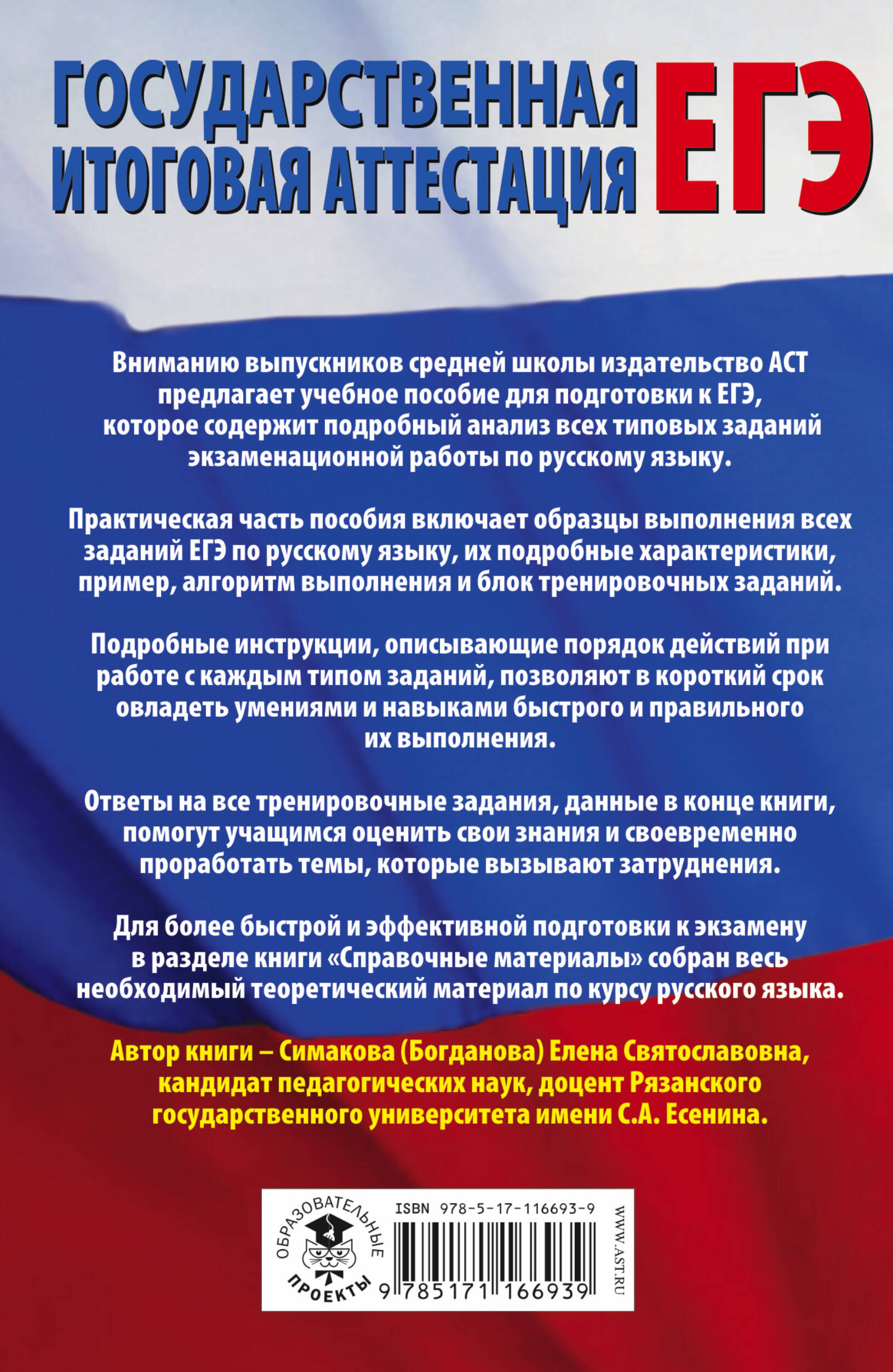 Вниманию выпускников средней школы издательство АСТ предлагает учебное пособие для подготовки к ЕГЭ, которое содержит подробный анализ всех типовых заданий экзаменационной работы по русскому языку. Практическая часть пособия включает образцы выполнения всех заданий ЕГЭ по русскому языку, их подробные характеристики, пример, алгоритм выполнения и блок тренировочных заданий. Подробные инструкции, описывающие порядок действий при работе с каждым типом заданий, позволяют в короткий срок овладеть умениями и навыками быстрого и правильного их выполнения. Ответы на все тренировочные задания, данные в конце книги, помогут учащимся оценить свои знания и своевременно проработать темы, которые вызывают затруднения. Для более быстрой и эффективной подготовки к экзамену в разделе книги «Справочные материалы» собран весь необходимый теоретический материал по курсу русского языка. Автор книги - Симакова (Богданова) Елена Святославовна, кандидат педагогических наук, доцент Рязанского государственного университета имени С.А.Есенина.| Издательство | ИЗДАТЕЛЬСТВО "АСТ" |