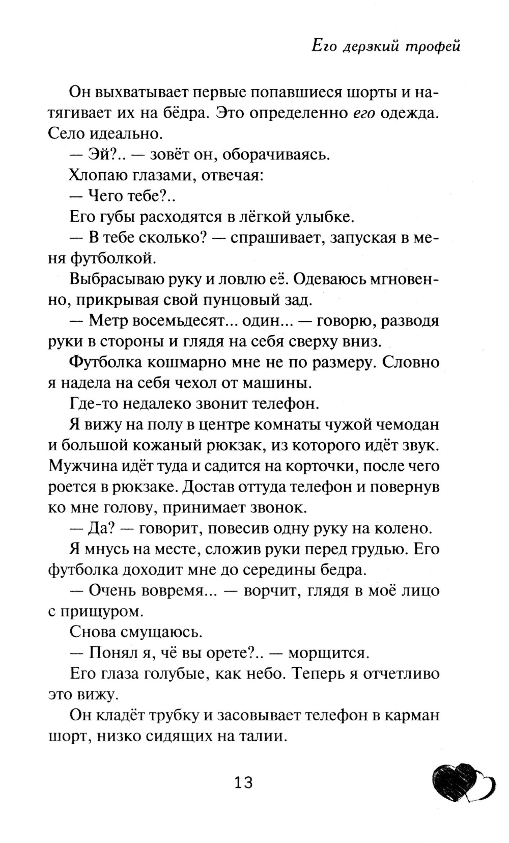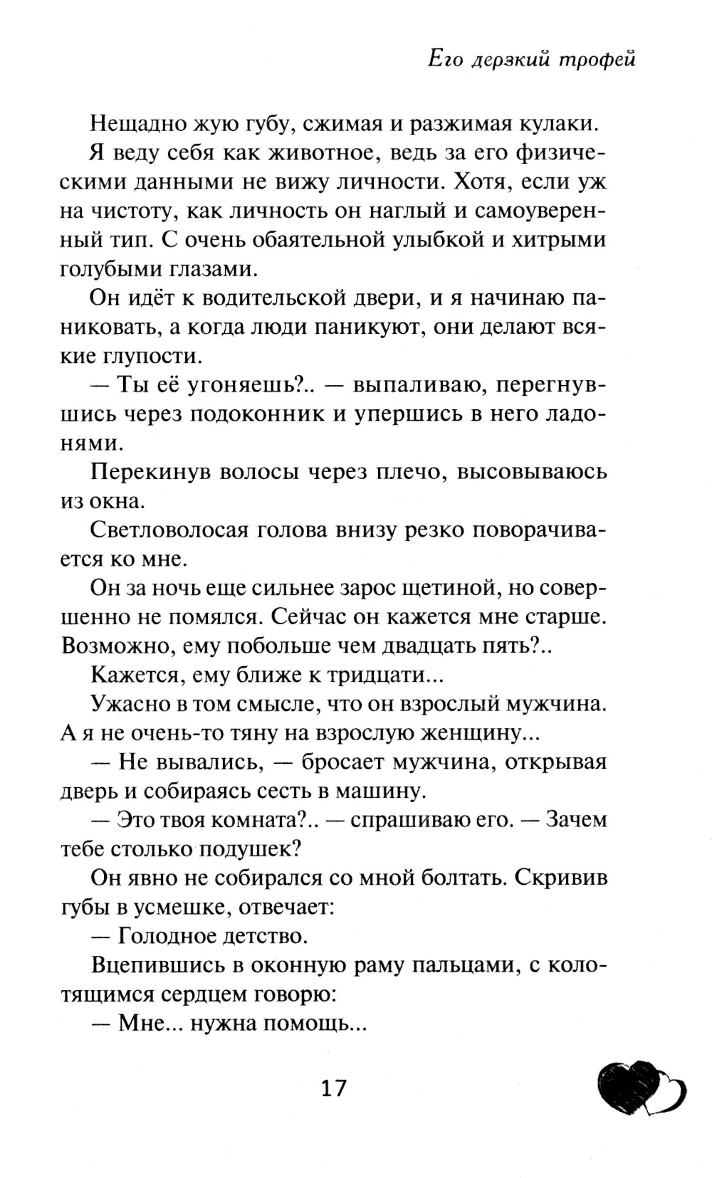 «Его дерзкий трофей» - современный роман о спорте и любви от Марии Летовой, автора, полюбившегося читателям за эмоциональные и чувственные истории любви! Провинциальная студентка Диана едет в столицу, чтобы немного подзаработать, но неожиданно в её жизнь вламывается Егор Благов - красавец спортсмен, баскетболист, сердцеед и бабник, в которого она влюбилась раньше, чем поняла - он замечает всех женщин в радиусе сорока тысяч километров, кроме неё самой.| Издательство | Дримбук |