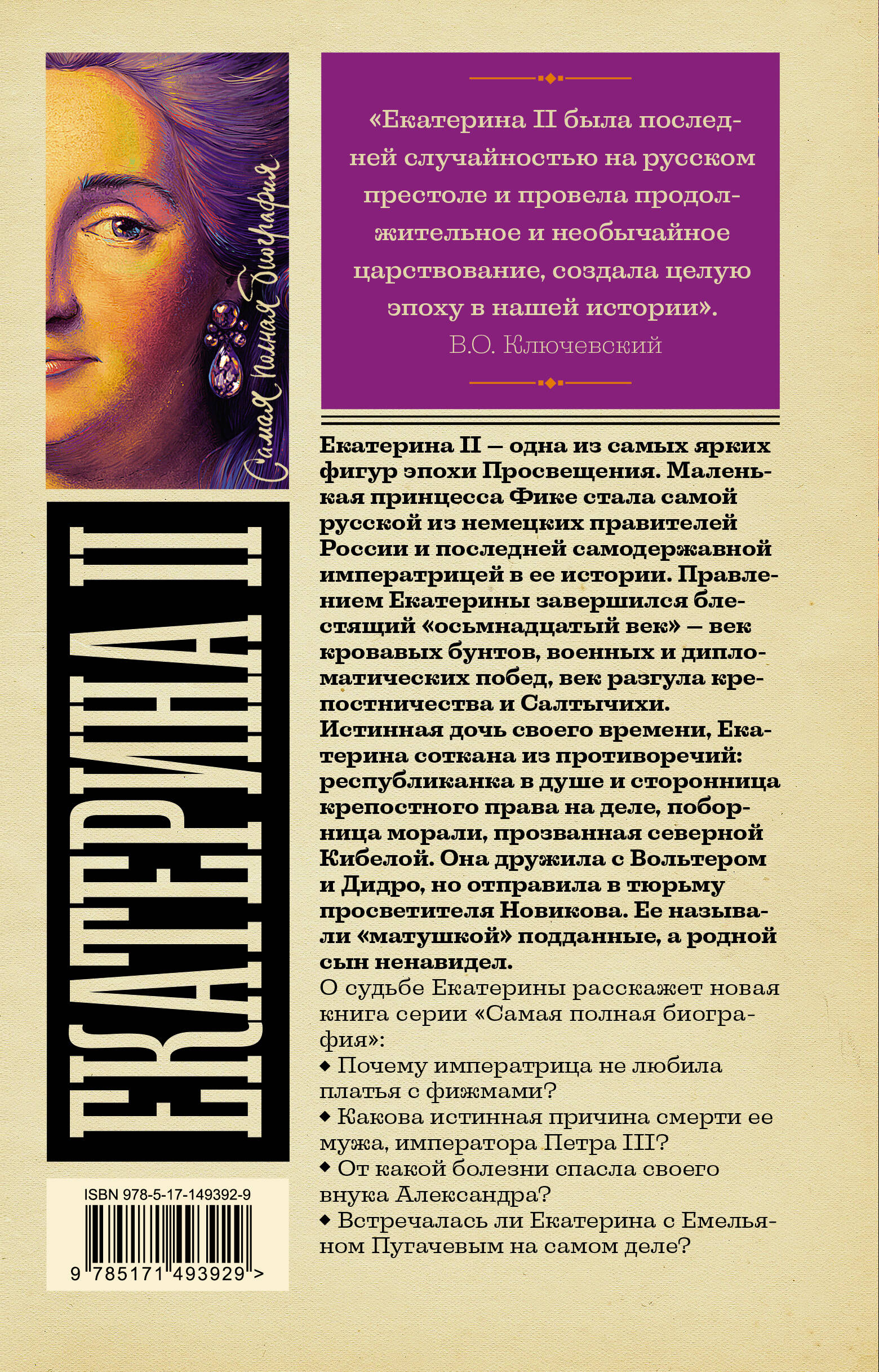 Екатерина II - одна из самых ярких фигур эпохи Просвещения. Маленькая принцесса Фике стала самой русской из немецких правителей России и последней самодержавной императрицей в ее истории. Правлением Екатерины завершился блестящий "осьмнадцатый век" - век кровавых бунтов, военных и дипломатических побед, век разгула крепостничества и Салтычихи. Истинная дочь своего времени, Екатерина соткана из противоречий: республиканка в душе и сторонница крепостного права на деле, поборница морали, прозванная северной Кибелой. Она дружила с Вольтером и Дидро, но отправила в тюрьму просветителя Новикова. Ее называли "матушкой" подданные, а родной сын ненавидел. О судьбе Екатерины расскажет новая книга серии "Самая полная биография": Почему императрица не любила платья с фижмами? Какова истинная причина смерти ее мужа, императора Петра III? От какой болезни спасла своего внука Александра? Встречалась ли Екатерина с Емельяном Пугачевым на самом деле? Ответы на эти и многие другие вопросы можно найти в новой книге серии "Самая полная биография".| Издательство | ИЗДАТЕЛЬСТВО "АСТ" |