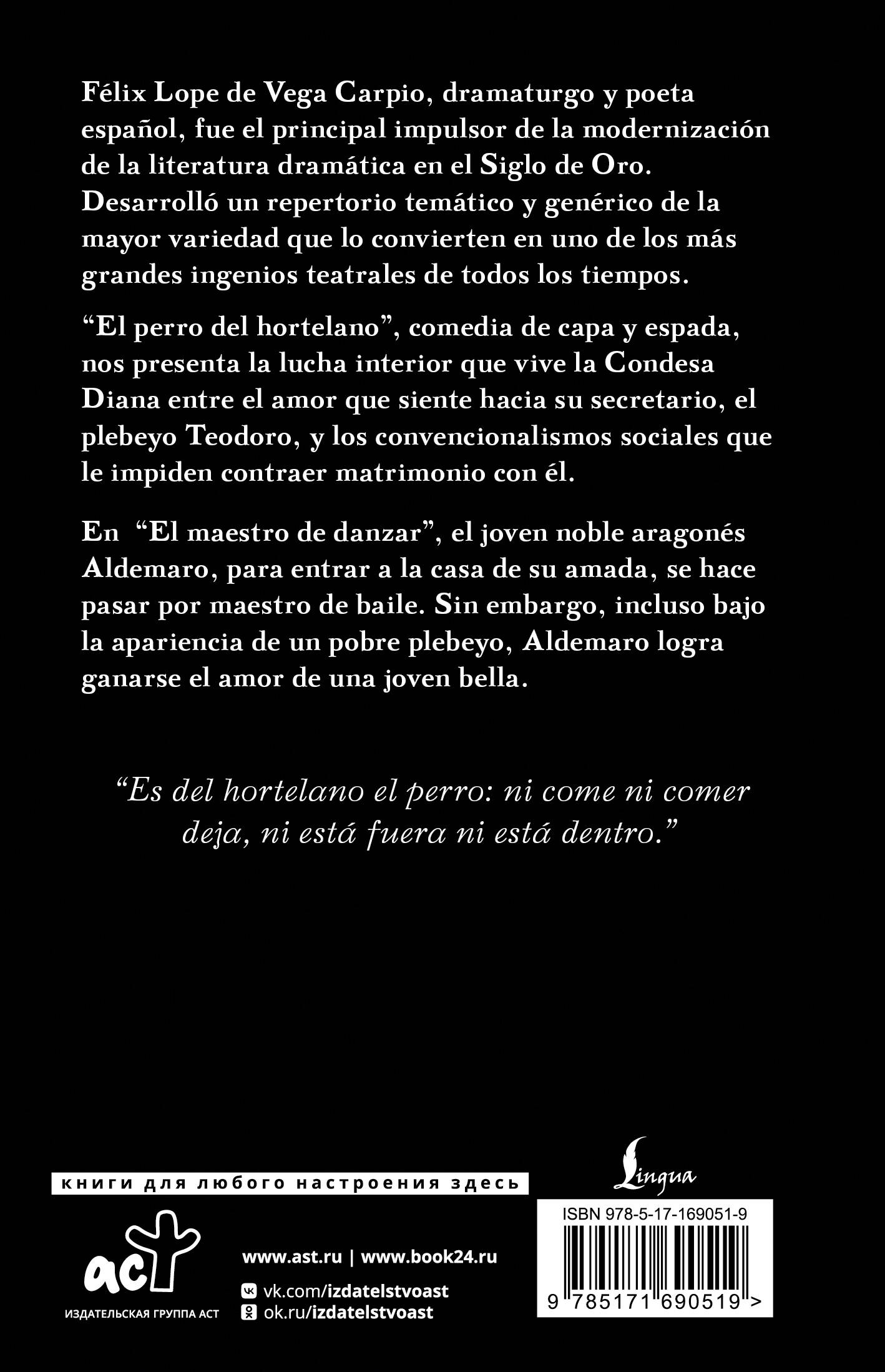 В пьесе "Собака на сене" графиня Диана разрывается между любовью к своему секретарю Теодоро и общественными устоями, мешающими ей выйти за него замуж. А в "Учителе танцев" молодой дворянин Альдемаро, чтобы проникнуть в дом своей возлюбленной, выдает себя за учителя танцев, однако даже под видом простолюдина завоевывает любовь прекрасной девы. Великий испанский драматург Лопе де Вега за свою жизнь написал несколько тысяч пьес, из которых до нас дошла примерно четверть. Комедии, полные жизни, юмора и любви, по-прежнему актуальны и продолжают покорять читателей и зрителей. Тексты комедий публикуются на испанском языке без адаптации и сокращений.| Издательство | Издательство "АСТ" |