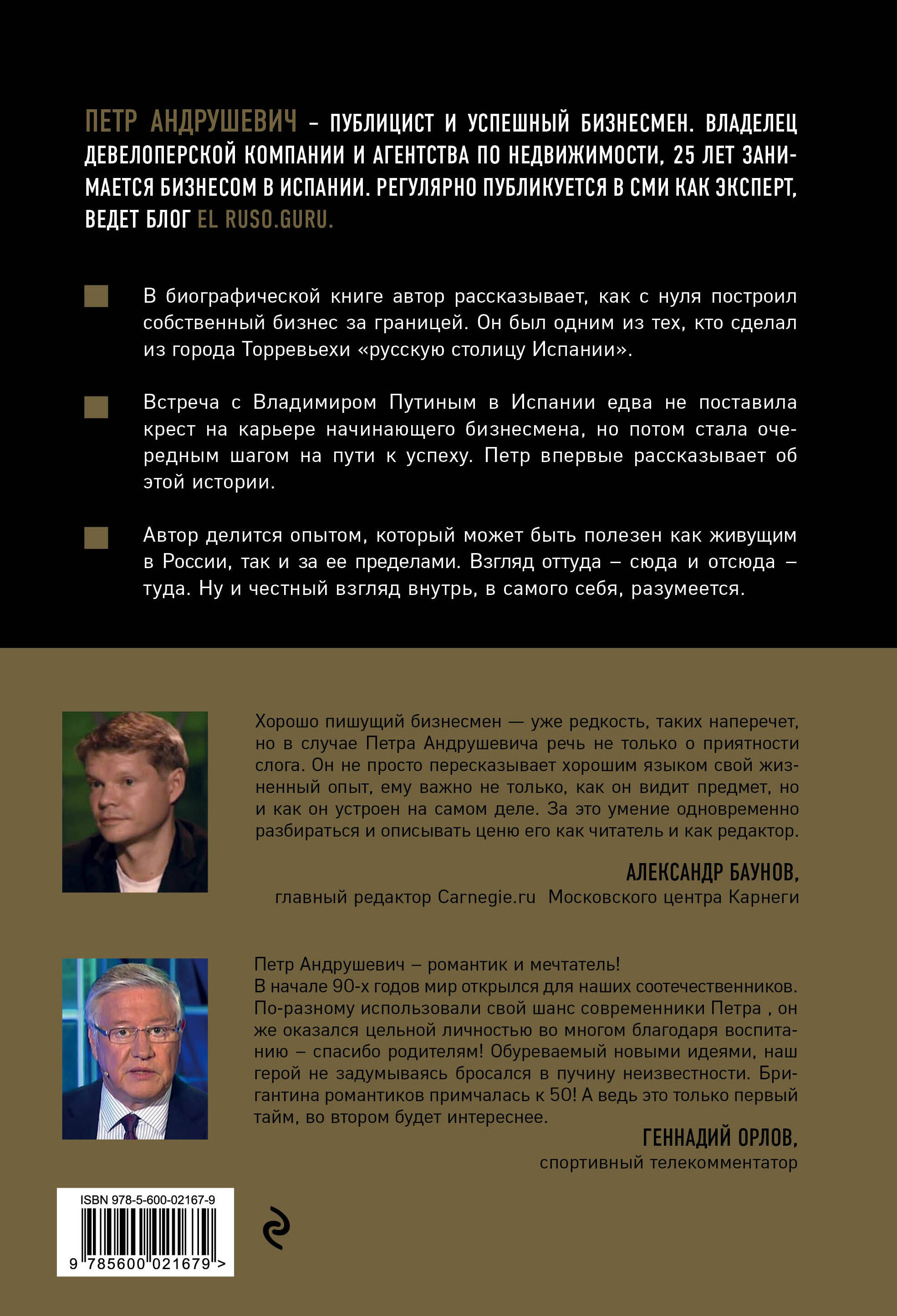 Петр Андрушевич - публицист и успешный бизнесмен. Владелец девелоперской компании и агентства по недвижимости, 25 лет занимается бизнесом в Испании. Простой петербургский парень с детства привык добиваться высот. Со школы работал в молодежной газете "Смена", затем гидом-переводчиком в "Интуристе". Работа в издательстве "ХХ треста", знакомство с Сергеем Никешиным и отъезд в испанскую Торревьеху помогли воплотить мечту - жить и работать в Испании. В биографической книге автор рассказывает, как с нуля построил собственный бизнес за границей. Он был одним из тех, кто сделал город Торревьеху "русской столицей Испании". Автор делится опытом, который может быть полезен как живущим в России, так и за ее пределами.| Издательство | ООО "Издательство "Эксмо" |