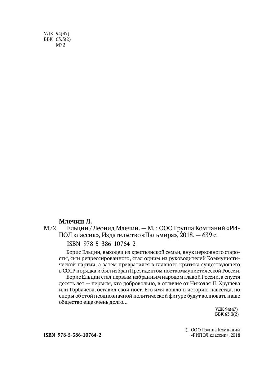 Борис Ельцин, выходец из крестьянской семьи, внук церковного старосты, сын репрессированного, стал одним из руководителей Коммунистической партии, а затем превратился в главного критика существующего в СССР порядка и был избран Президентом посткоммунистической России. Борис Ельцин стал первым избранным народом главой России, а спустя десять лет - первым, кто добровольно, в отличие от Николая II, Хрущева или Горбачева, оставил свой пост. Его имя вошло в историю навсегда, но споры об этой неоднозначной политической фигуре будут волновать наше общество еще очень долго...| Издательство | Рипол Классик |