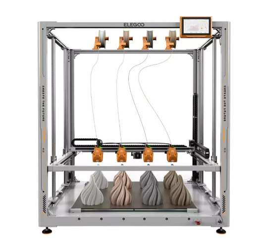 ELEGOO OrangeStorm Giga промышленный 3D-принтер FDM с огромным рабочим объёмом, предназначенный для создания крупных объектов с высокой детализацией. Он оснащён четырьмя независимыми нагреваемыми платформами, что позволяет печатать многозадачно, а также поддерживает до четырёх сопел для одновременной печати. Принтер обеспечивает скорость печати до 300 мм/с и оснащён мощным охлаждением для стабильной работы при высоких скоростях.